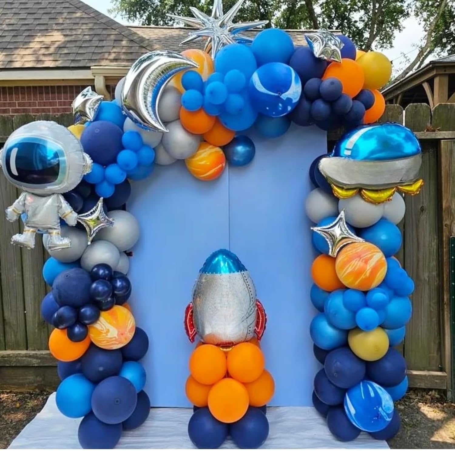 - 12 Inch Space Balloon Set: 5 x metallic silver balloons, 8 x orange balloons, 5 x pearl night blue balloons, 5 x metallic midnight blue balloons, 3 x metallic blue balloons, 2 x 10-inch agate yellow balloons, 2 x 10-inch agate blue balloons, and 1 x blue ribbon. This cosmic combination of orange and blue balloons is ideal for creating a space-themed party or celebration.