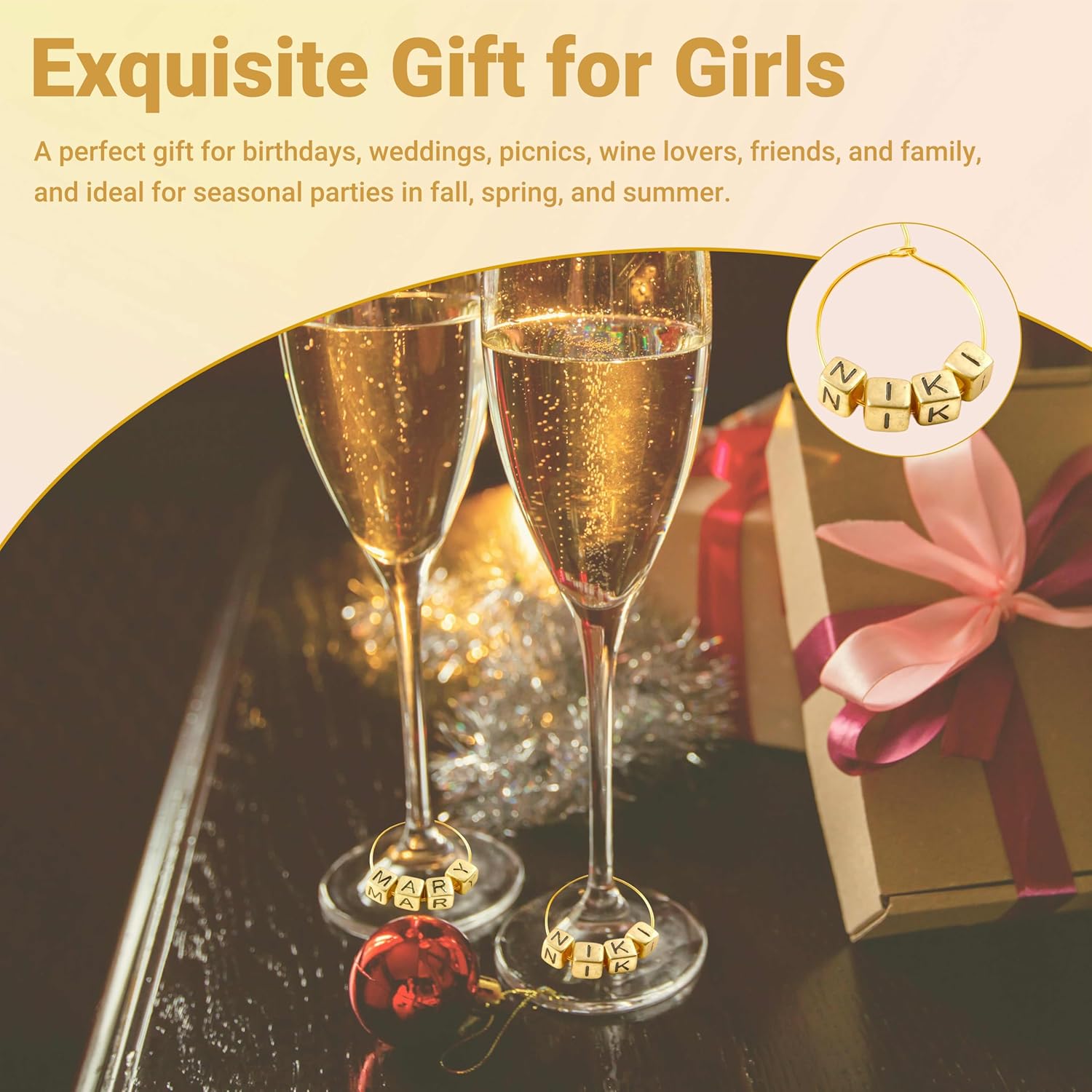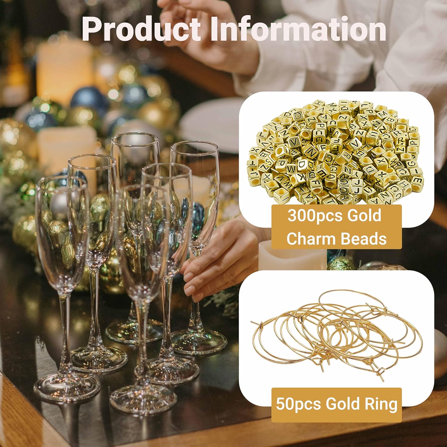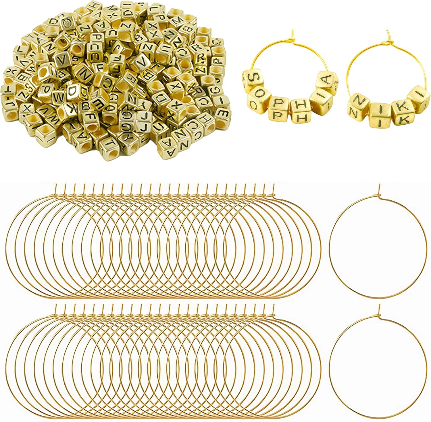 - DIY Wine Charms Kit: 300 distressed gold square letter beads + 50 KC gold-plated hoops (1-inch diameter) create name tags or phrases like "Cheers" for drinkware identification