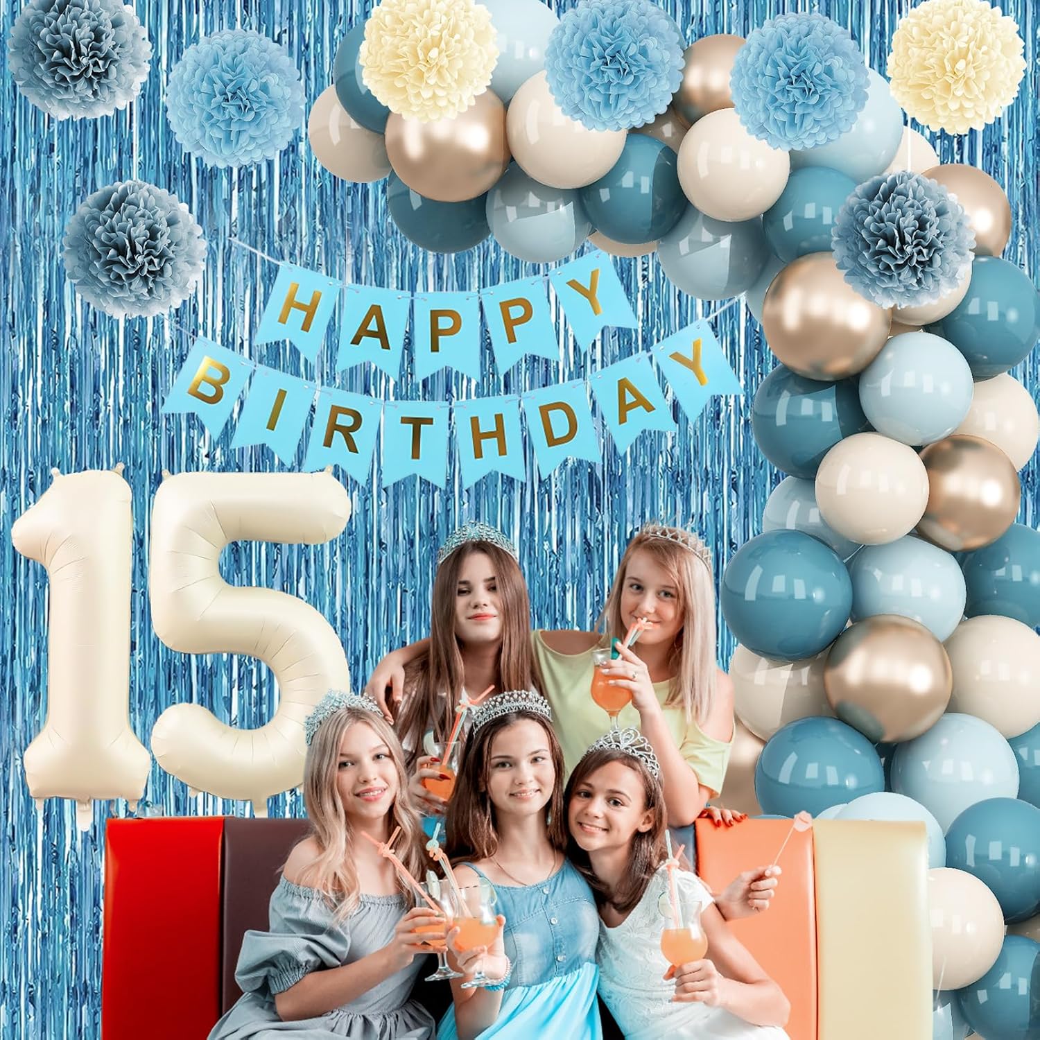 - ALL-IN-ONE DECORATION: Comes with a “15” foil number balloon, includes everything you need: birthday banner, fringe curtain, blue beige gold balloons, star foil balloons, paper pom poms, and ribbon, ideal for 15 year old birthdays, 15th birthday party, photo shoots, and family gatherings, suits both indoor and outdoor setups