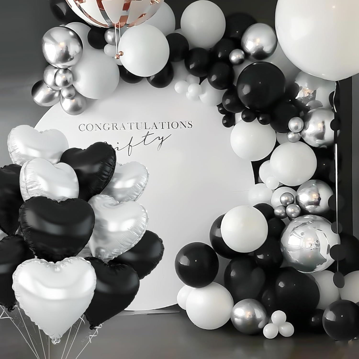 - WIDELY APPLICATION:This black silver heart balloon can be used for a variety of occasions,such as birthday,anniversary,Valentine's Day,Mother's Day,baby shower,gender reveal,weddings,engagement,bridal shower,marriage proposals and other parties,can also be used as a photo background,etc.Make a deep impression on the party guests.