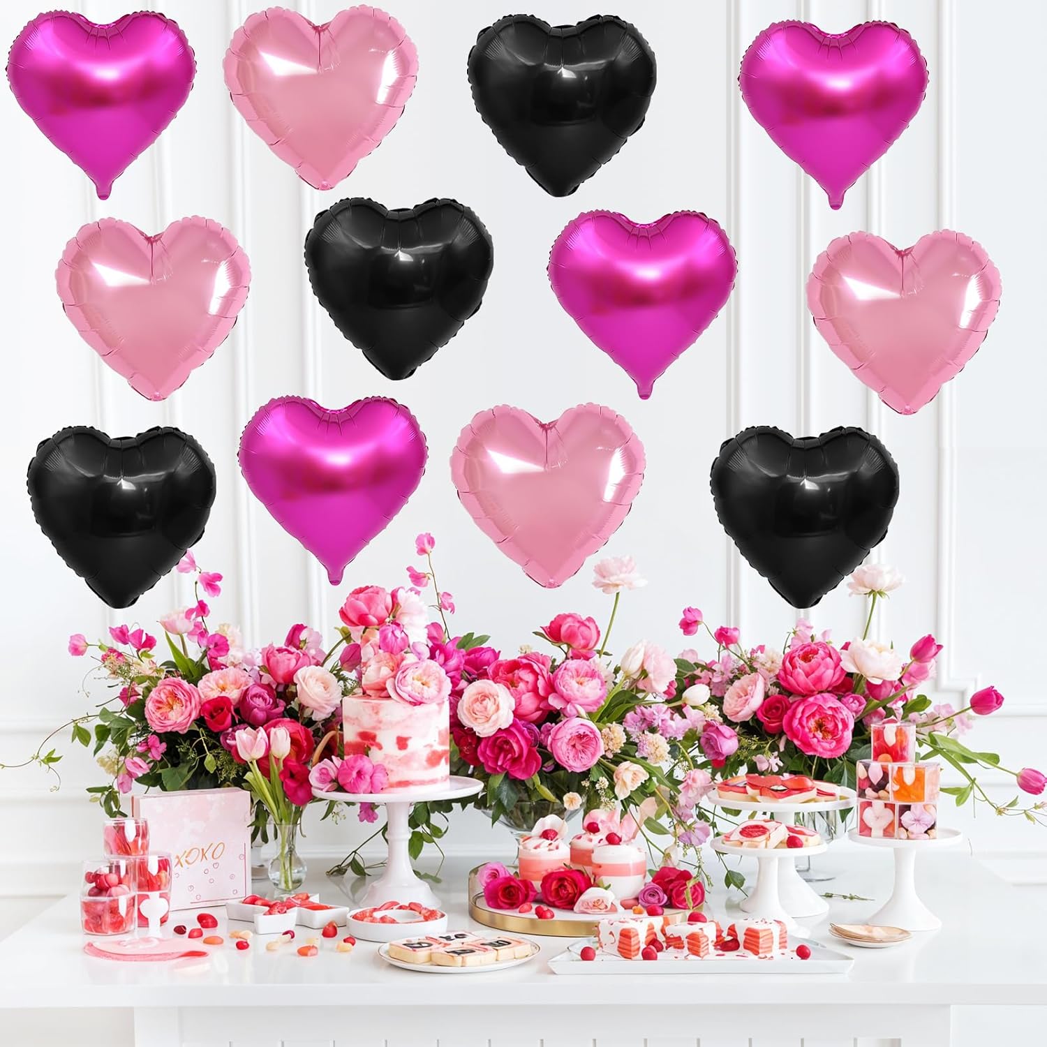 - WIDELY APPLICATION:This pink black heart balloon can be used for a variety of occasions,such as birthday,anniversary,Valentine's Day,Mother's Day,baby shower,gender reveal,weddings,engagement,bridal shower,marriage proposals and other parties,can also be used as a photo background,etc.Make a deep impression on the party guests.