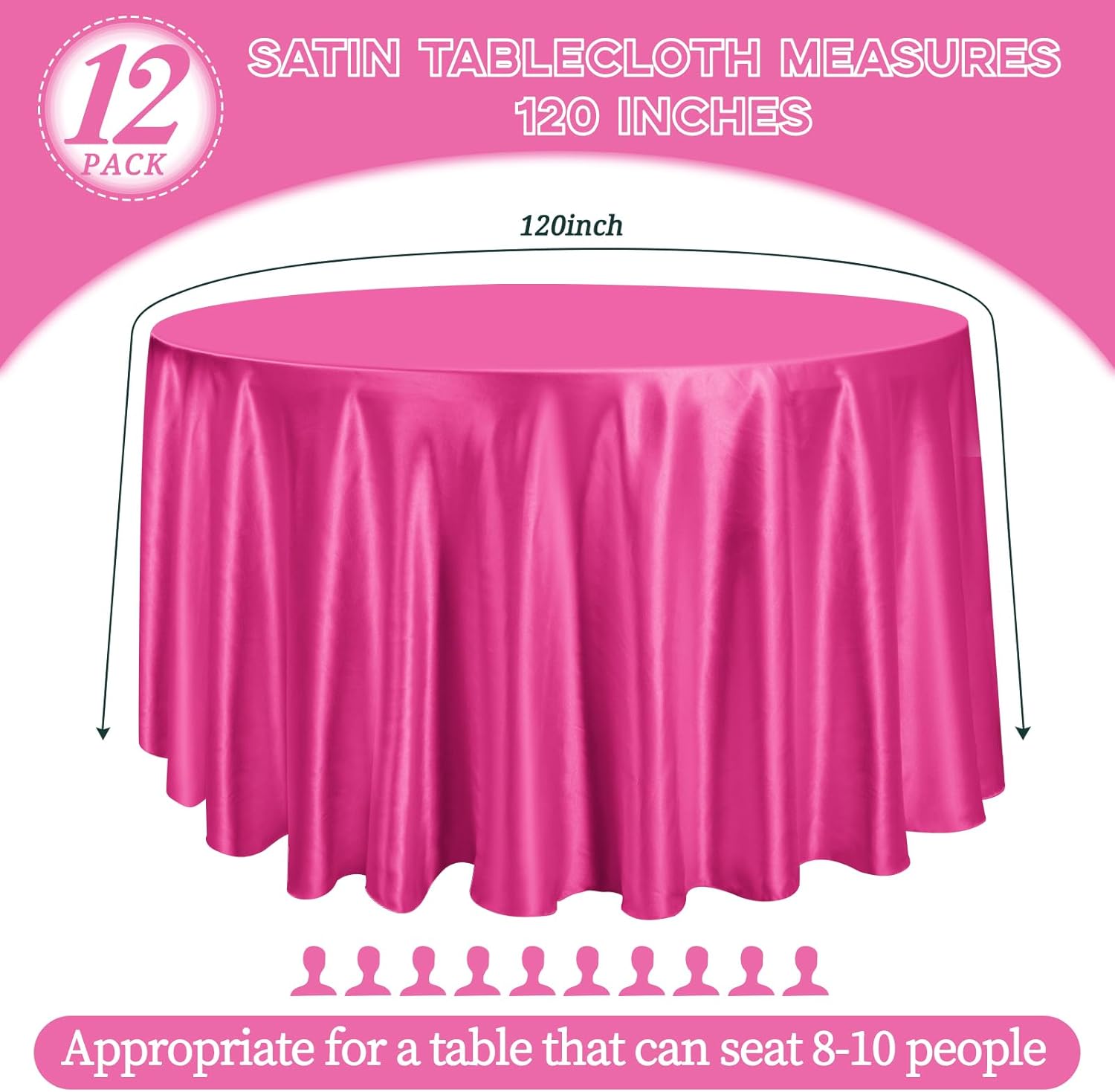 - 【Round Satin Tablecloths】12 Pieces premium hot pink satin round tablecloth. The size of silk satin table cover is 120 inches, large enough to decorate a table that can accommodate 8-10 persons. It is suitable for most household round tables and can meet your different needs. Sufficient quantities are sufficient for party decoration. The tablecloth size is usually larger than your table size. Please measure your table size before buying.