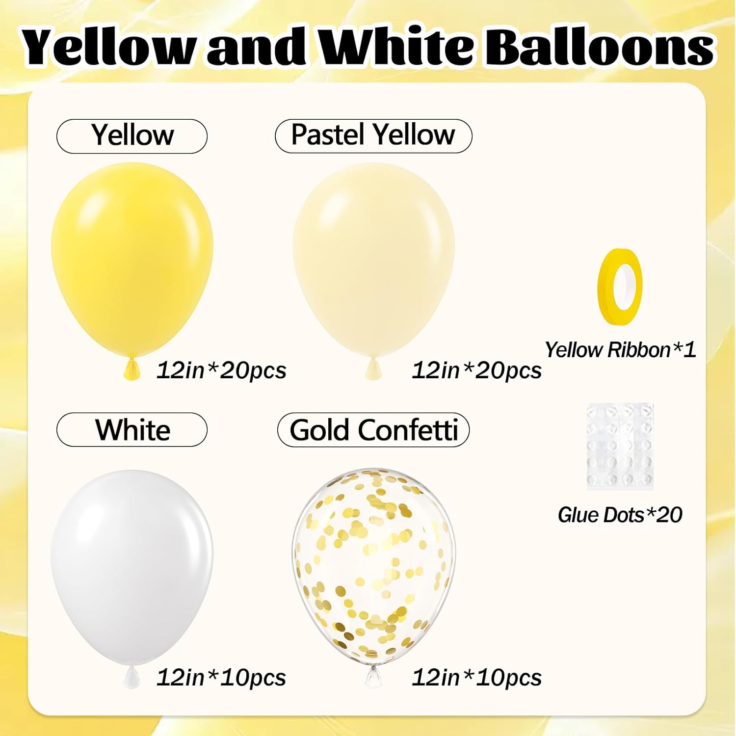 - Package Include: The yellow and white balloons include 12inch yellow balloonsx20, 12inch pastel yellow balloonsx20, 12inch white balloonsx10, 12inch gold confetti balloonsx10, glue dotsx20, yellow ribbonx1