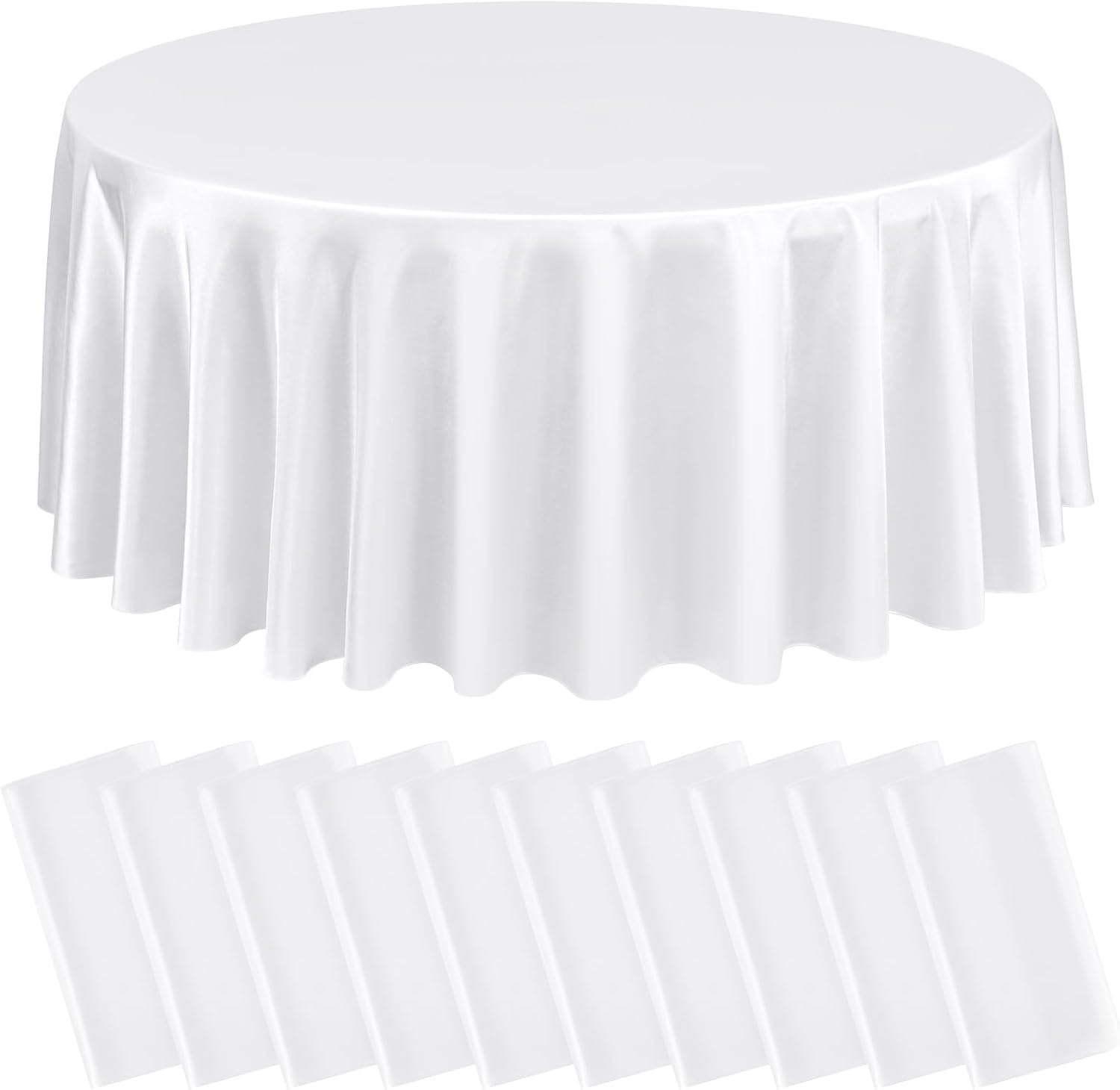 - Package List: You will get 10 packs white satin tablecloth.The size of satin table covers are 120 inch/305 cm, which is large enough to decorate a table that can accommodate 10-12 persons.The tablecloth size is usually larger than your table size. Please measure your table size before buying.
