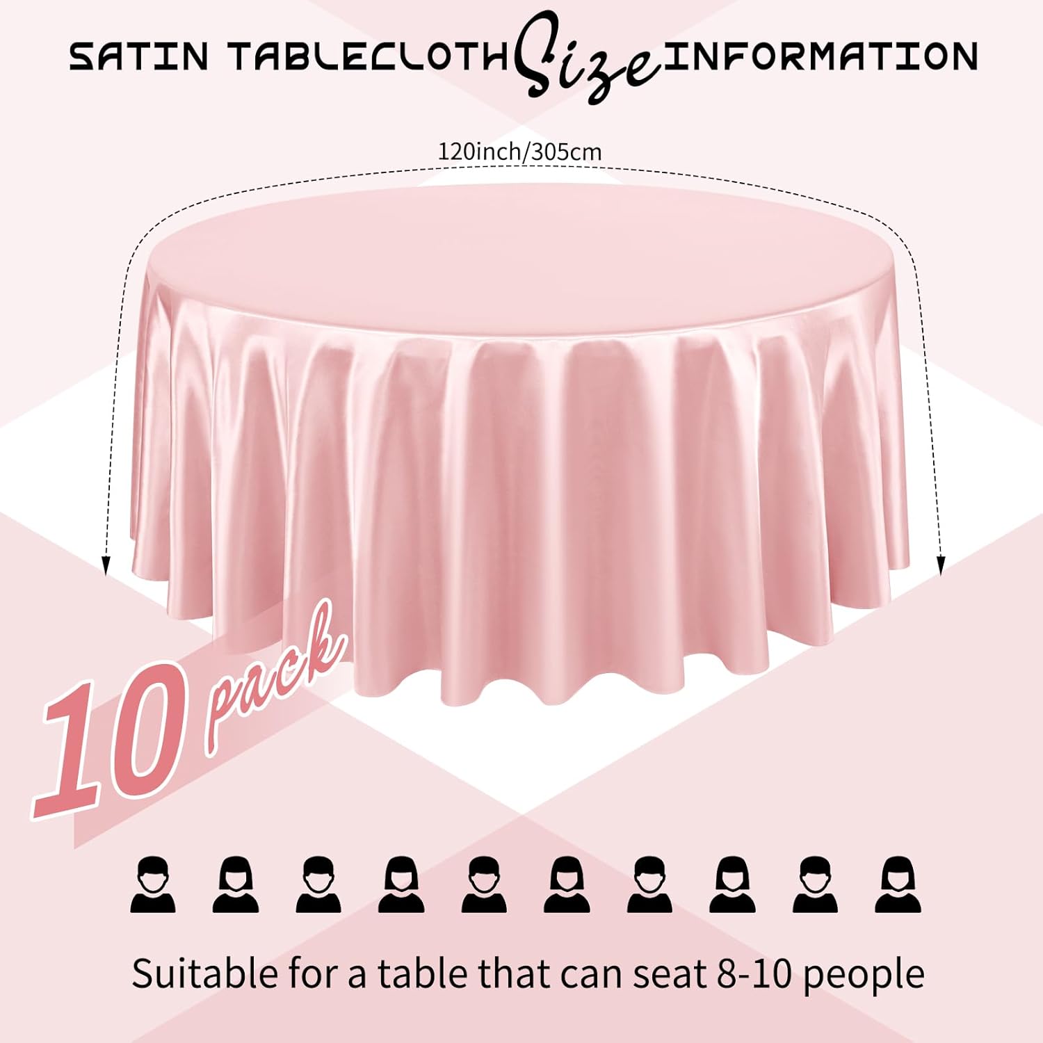 - Package List: You will get 10 packs rose gold satin tablecloth.The size of satin table covers are 120 inch/305 cm, which is large enough to decorate a table that can accommodate 10-12 persons.The tablecloth size is usually larger than your table size. Please measure your table size before buying.