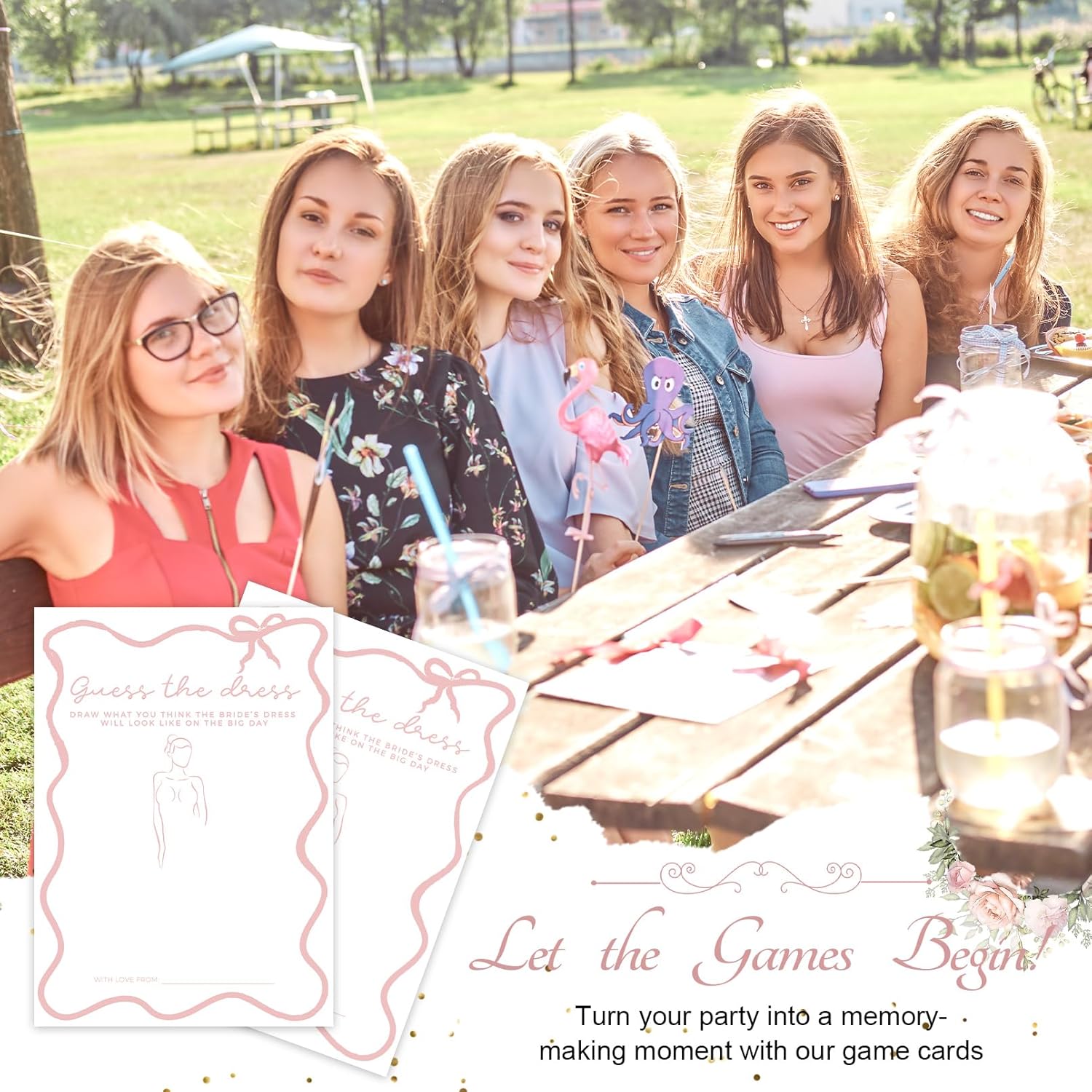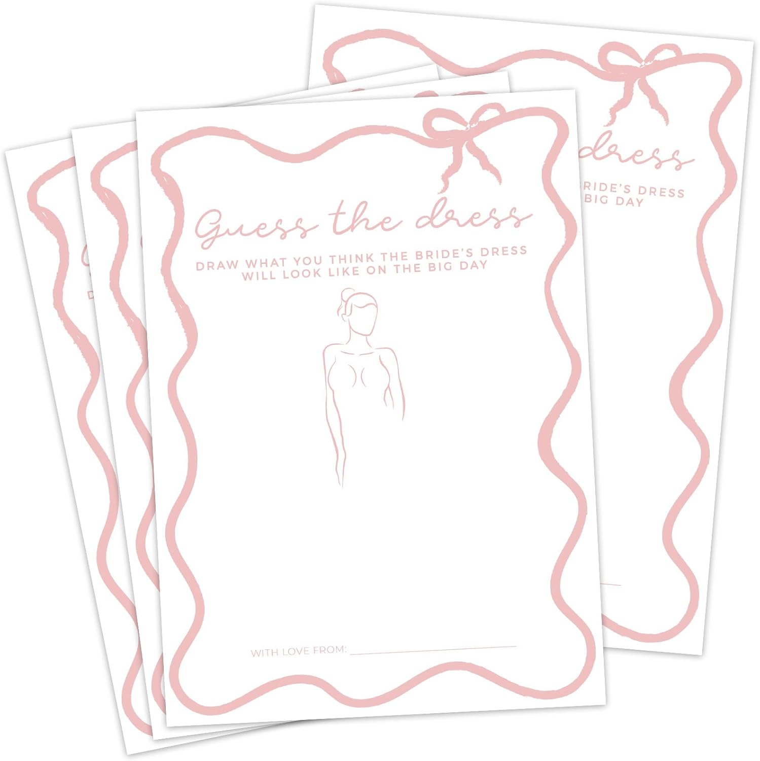 DEEKA 30 PCS Bridal Shower Games Card for 30 Guests White Pink Wavy Border Ribbon Bow Funny Wedding Bachelorette Party Games for Reception (Guess The Dress)
