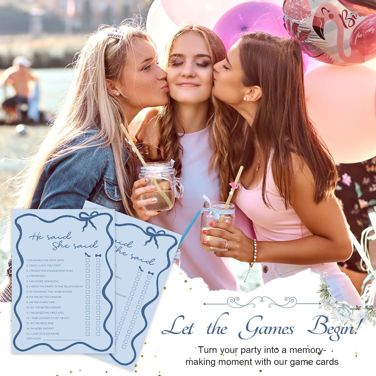 DEEKA 30 PCS Bridal Shower Games Card for 30 Guests Blue Wavy Border Ribbon Bow Funny Wedding Bachelorette Party Games for Reception (He Said She Said)