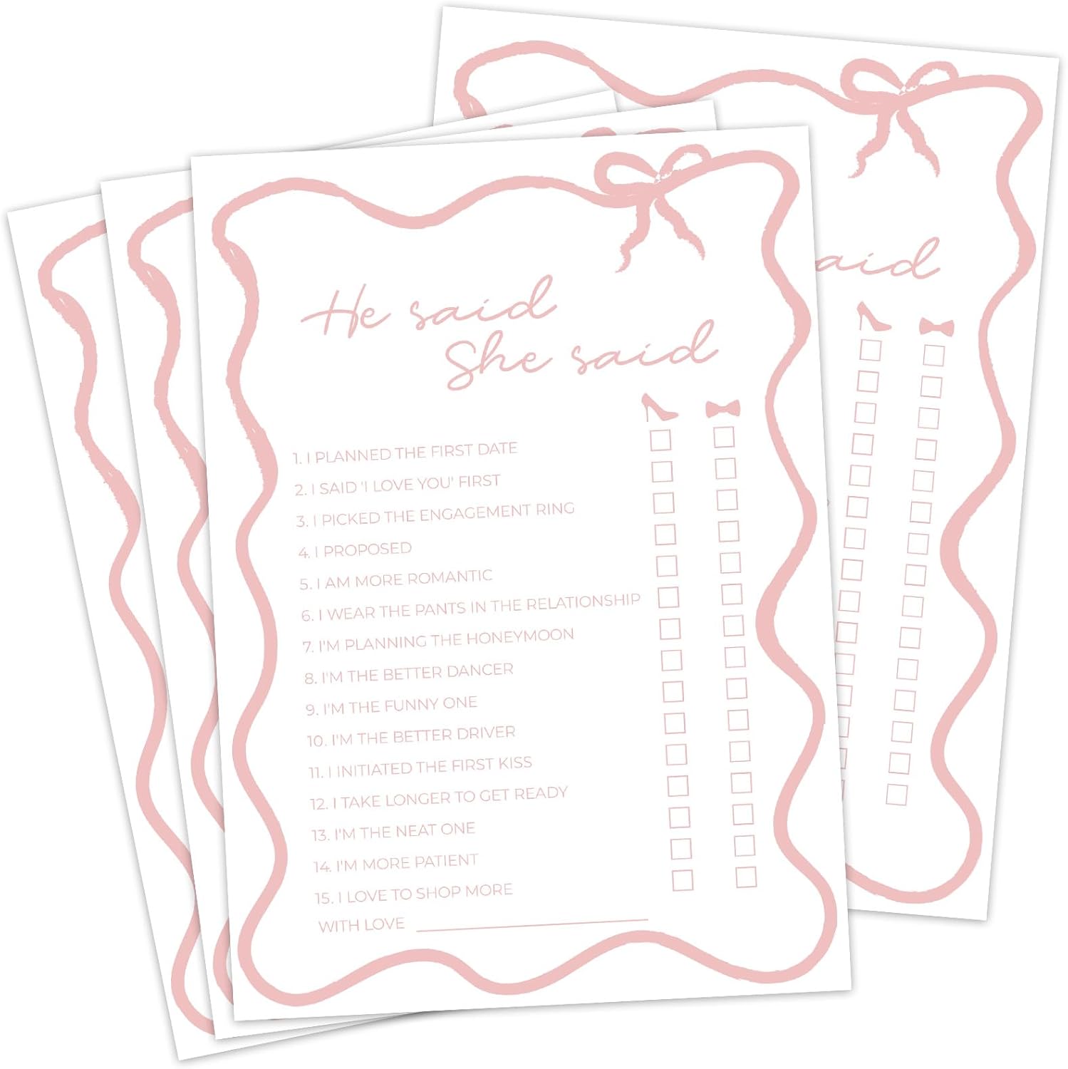 DEEKA 30 PCS Bridal Shower Games Card for 30 Guests White Pink Wavy Border Ribbon Bow Funny Wedding Bachelorette Party Games for Reception (He Said She Said)