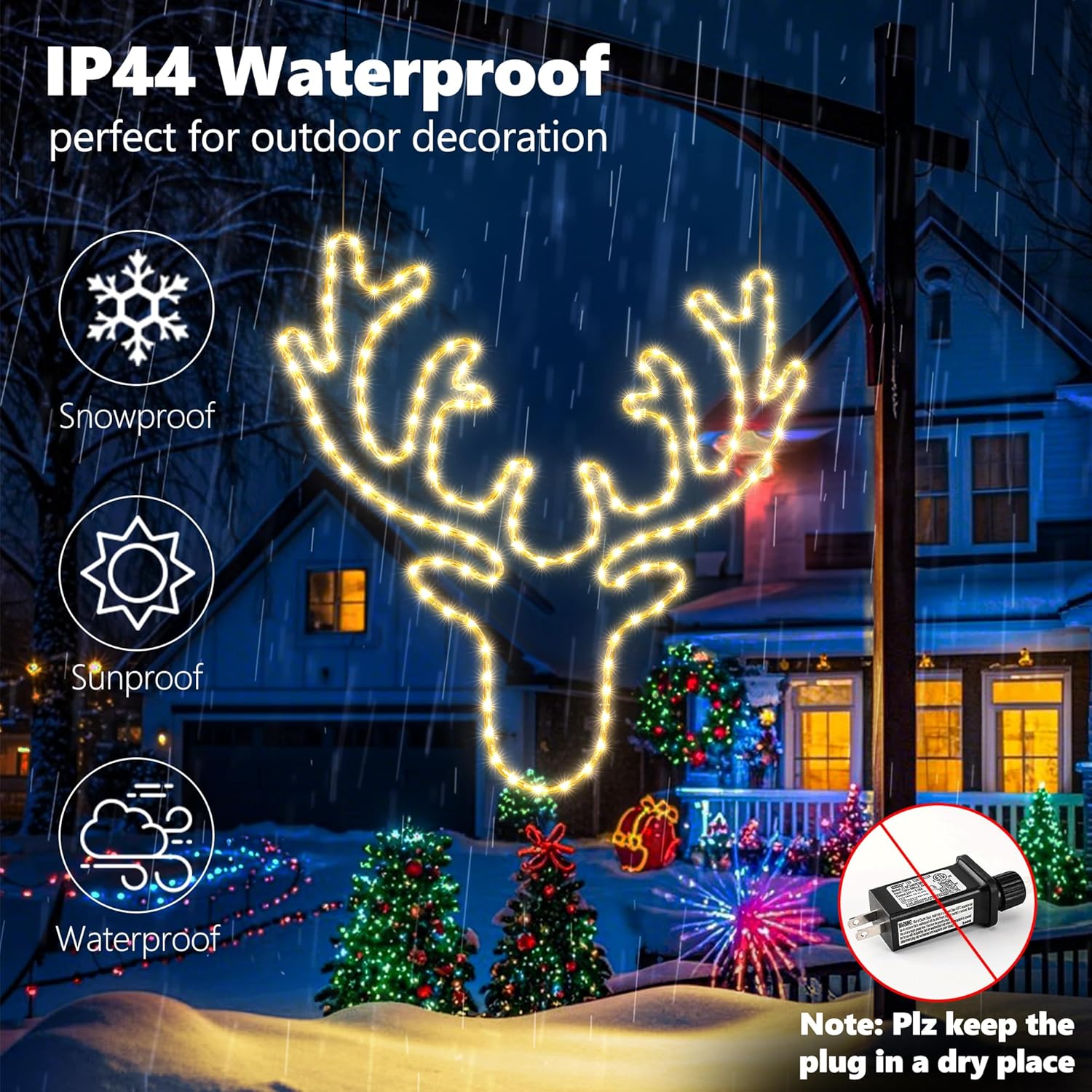- CHRISTMAS REINDEER LIGHTS: 9.8 FT Long lead wire. Just plug in OR unplug it for power on or off. 24V low volatge, safe for your family. Perfect for indoor and outdoor, easy to install, and look great! Brighten up any occasion widely including Christmas parties, weddings, thanksgiving days, gardens.