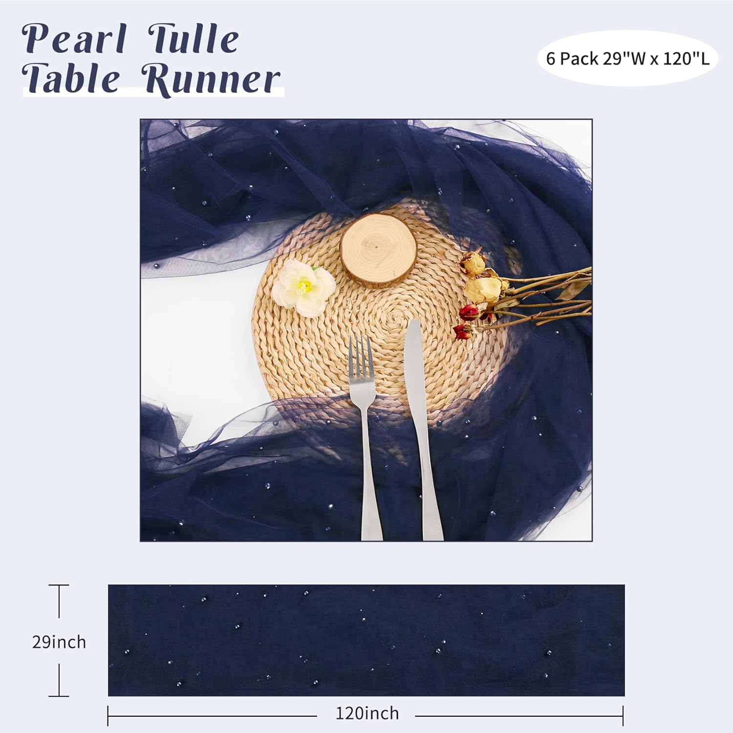 Set of 6 Pearl Table Runner 29 x 120 Inch Tulle Fabric Lace Table Runners Boho Rustic Tablecloth for Bridal Shower Birthday Party Wedding Arch Aisle Veil Dessert Table Decor(Navy Blue)