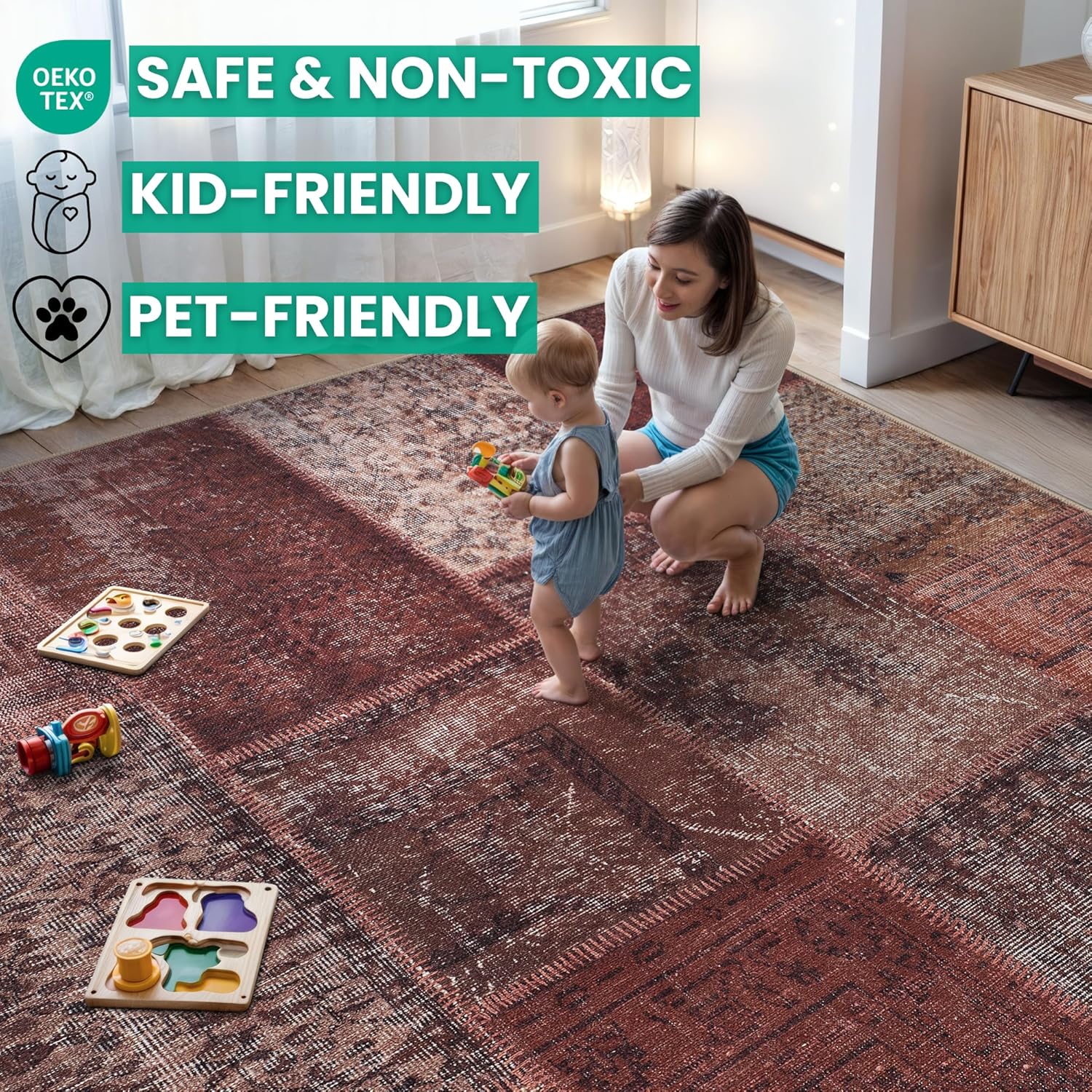 Bloom Rugs Washable Non-Slip 5' x 7' Rug - Red/Brown Traditional Patchwork Area Rug for Living Room, Bedroom, Dining Room, and Kitchen - Exact Size: 5' x 7'