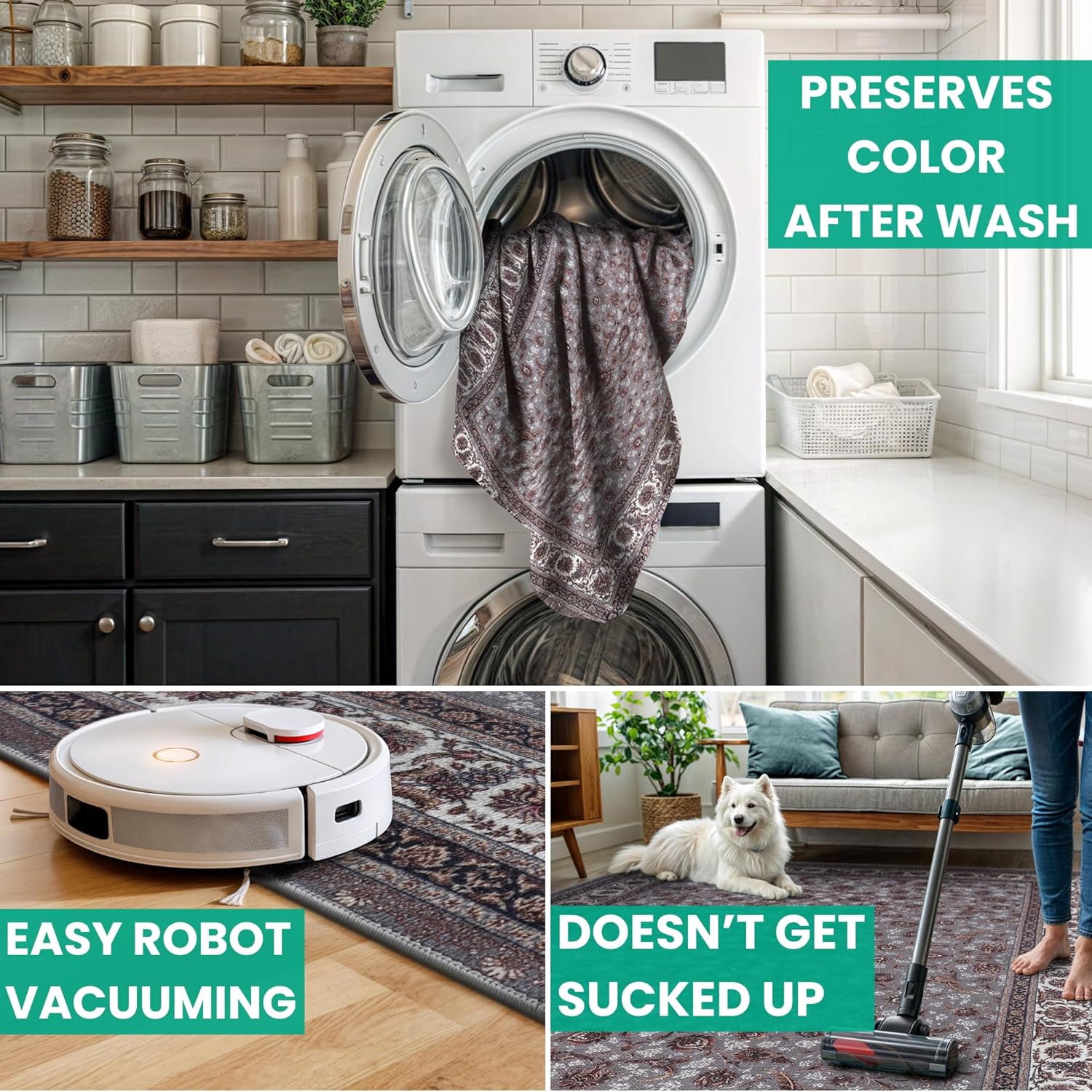 - MACHINE WASHABLE: Machine wash on delicate cycle (do not use bleach) at 85°F (30°C) and line dry or dry on air-only cycle without heat. Vacuum regularly and spot clean small stains. This easy to clean rug is perfect for families with kids and pets, and for high traffic areas.