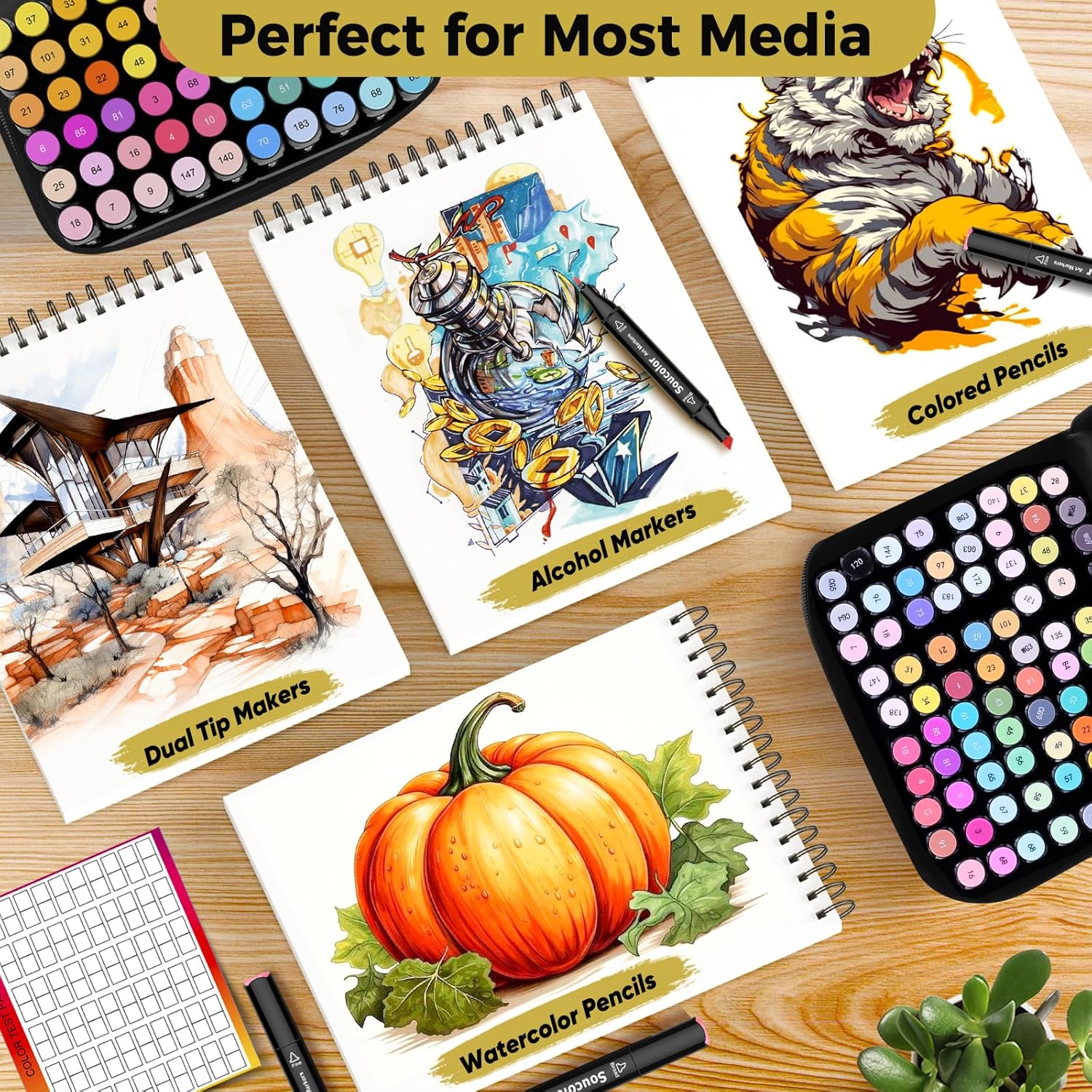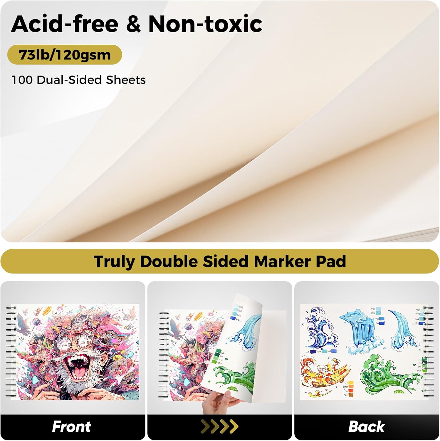 - Premium 120LB (200GSM) Marker Paper & Sketch Pad - Our professional-grade bleedproof sketchbook features a sturdy, sustainable white surface that handles alcohol markers, acrylic paint, and all artistic techniques without bleeding. The smooth texture works perfectly with sketching, coloring, and blending, while the double-sided design provides 200 usable pages (100 sheets) for extended creativity.