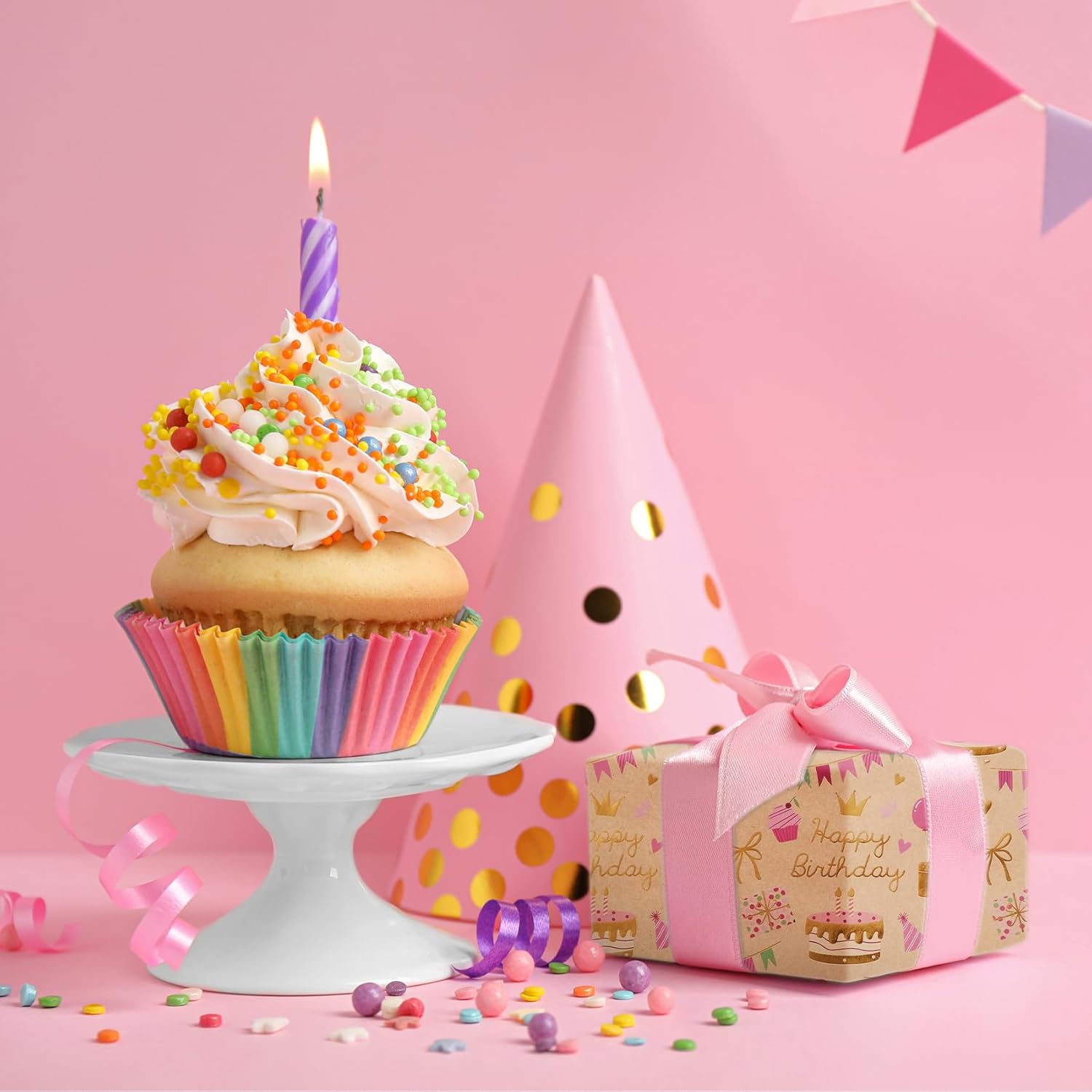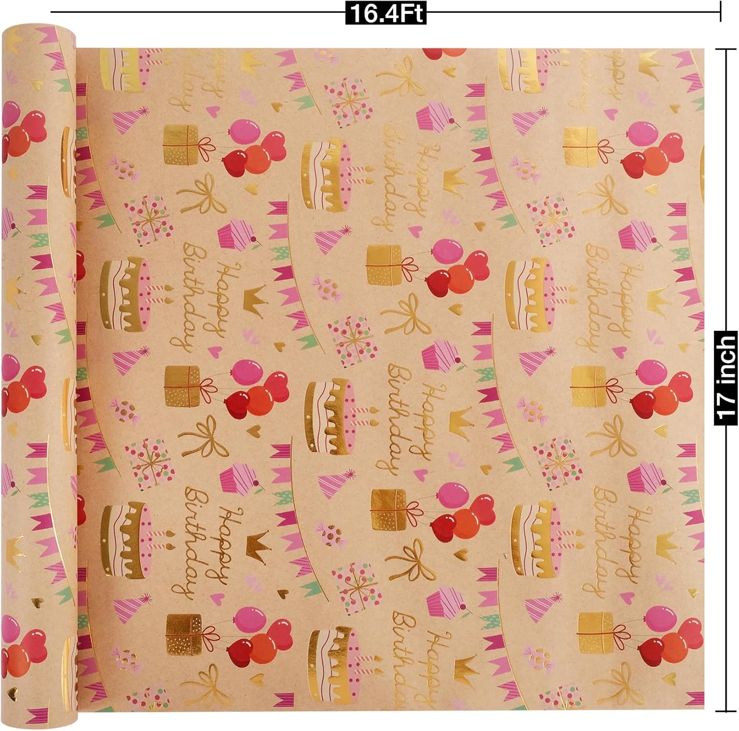 - Happy Birthday Design :Featuring gold foil "Happy Biythday" text surrounded by gift box, balloon, bow, colorful flag, crown, this wrapping paper creates a fun and joyful atmosphere perfect for any celebration
