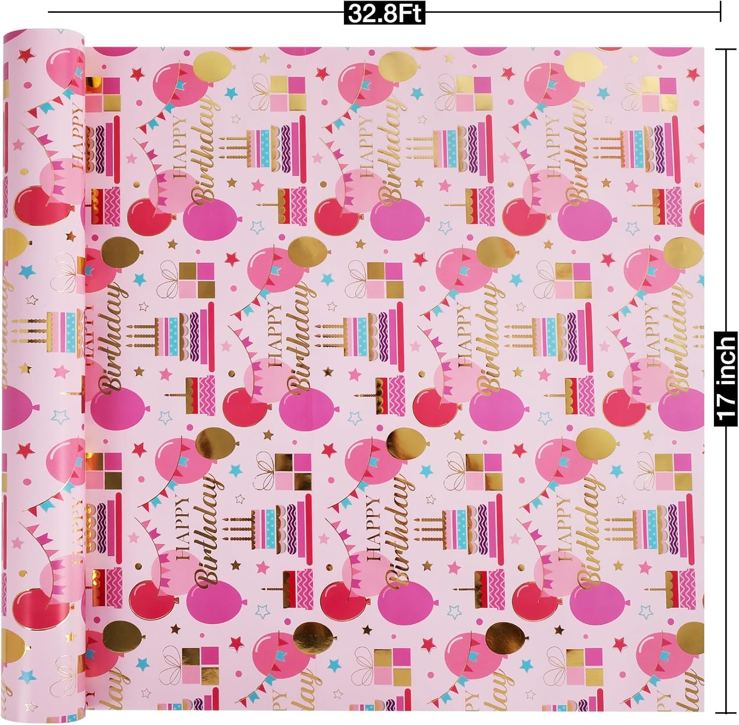 Aimyoo Pink Birthday Wrapping Paper Roll - 17 Inch X 32.8 Feet - Gold Foil Celebration Cake, Balloon, Happy Birthday Lettering Design Gift Wrap for Kids, Baby Showers