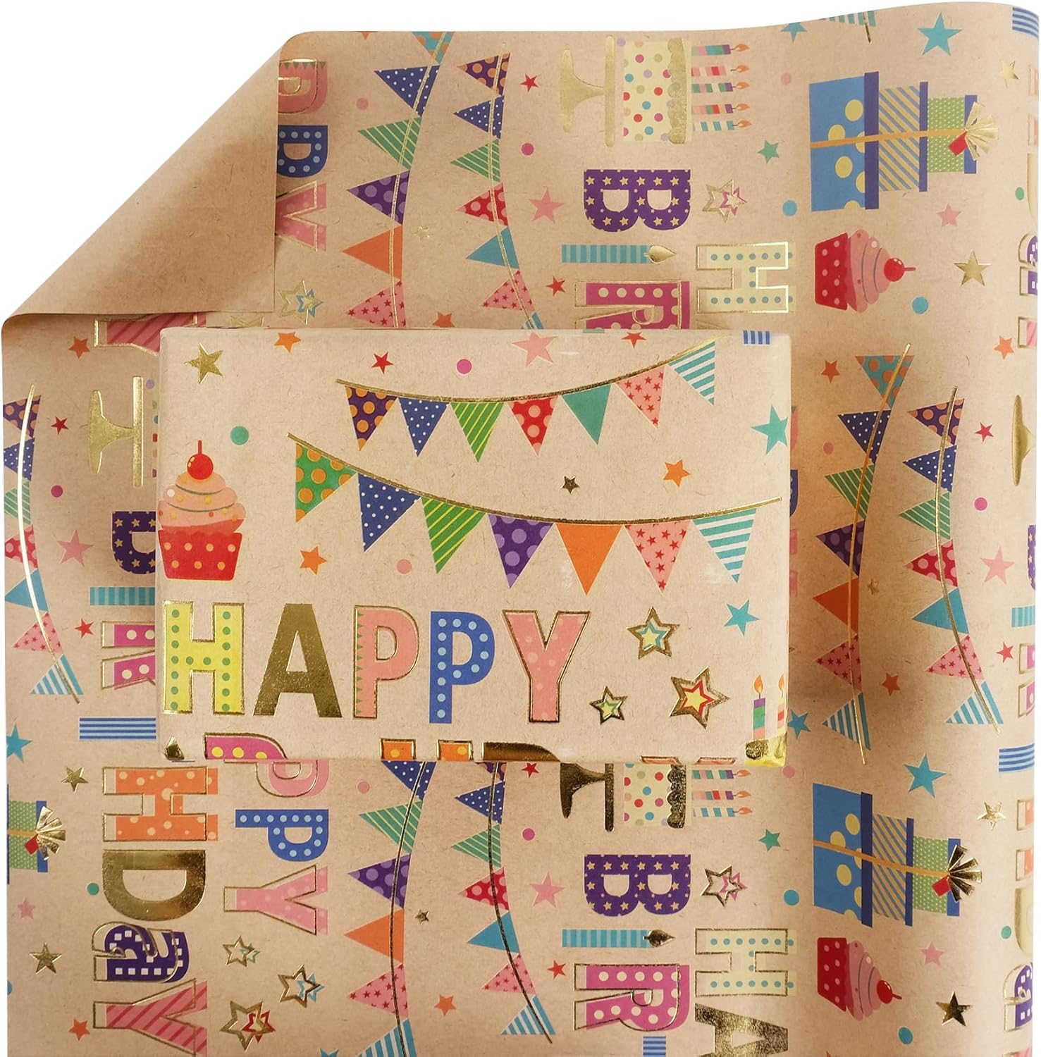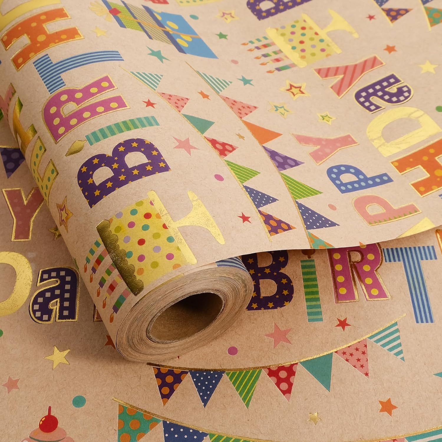 Aimyoo Colorful Birthday Wrapping Paper Roll - 17 Inch X 32.8 Feet - Gold Foil Happy Birthday Lettering, Cupcake & Flags Design Gift Wrap for Kids, Baby Showers