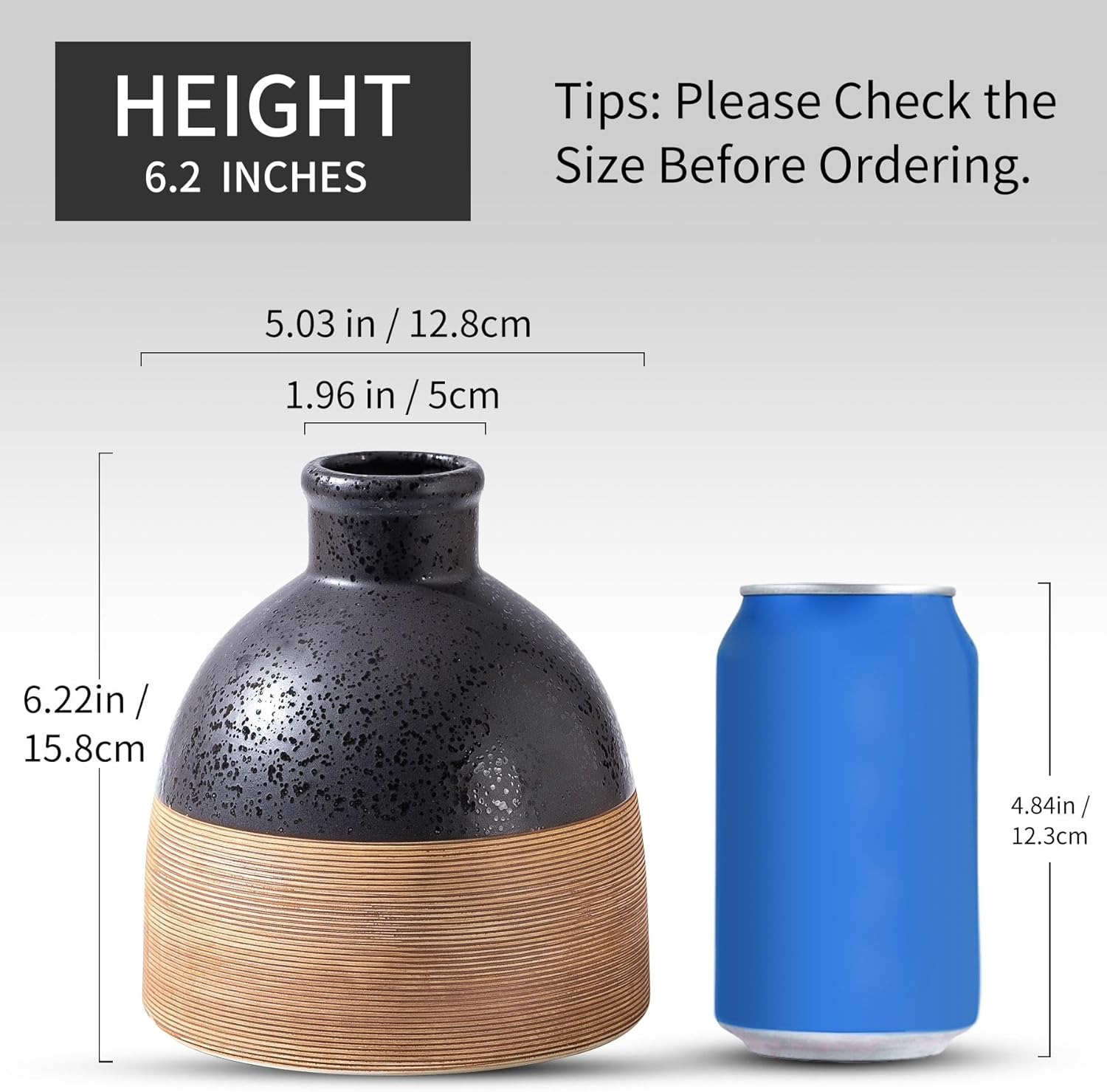 Black and Brown Rustic Farmhouse Flower Round Ceramic Striped Vase, Modern Bohemian Ceramic Floral Vase for Home Cottage Core Decor, Table, Living Room, Bookshelf Decor, Mantel, Wedding 6.5 Inch