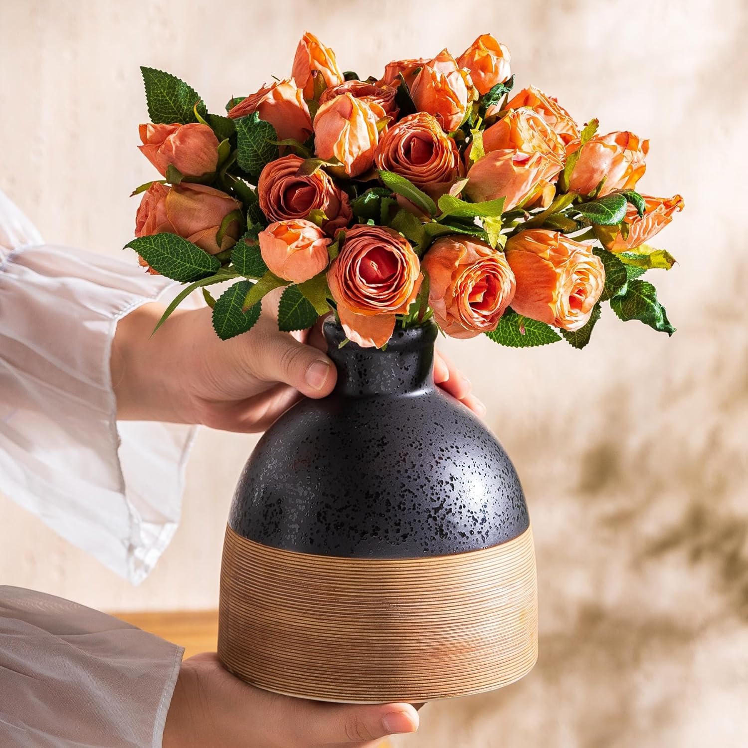 - 【Hemispheric Two-Tone Striped Design & Rustic Charm】SURE YUESI round ceramic vase features a unique half-black, half-brown horizontal striped hemispheric silhouette (6.5x5.7x5.4 Inch), blending modern geometry with rustic farmhouse aesthetics. Perfect as mantle decorations, cottage core table centerpieces, or black living room decor accents.