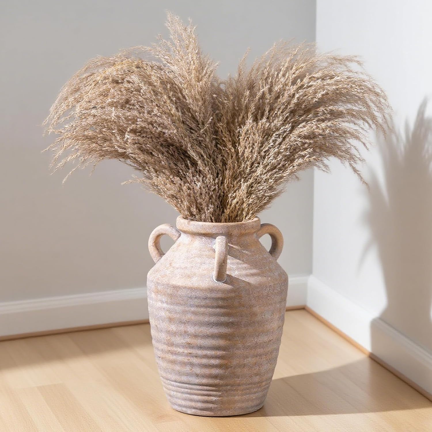- Durable Three-Handle Design & Functional Craftsmanship: Built to last, this farmhouse vase features three sturdy handles for easy placement as mantle decorations or living room accents. Its wide 3.75-inch mouth accommodates bouquets, dried grasses, or standalone styling, while the textured surface and flat non-slip base ensure stability.