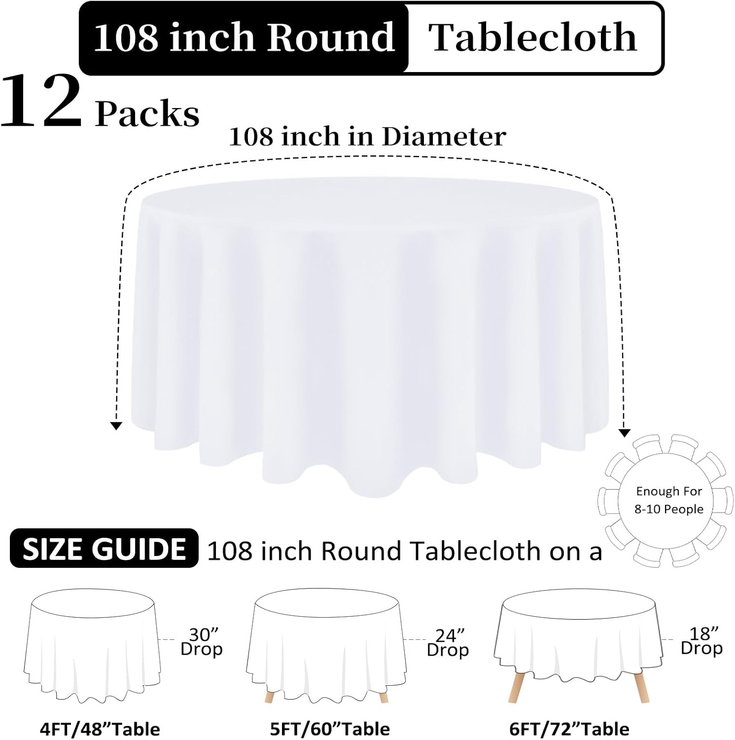 - Measurements and Colors: This white cloth tablecloths is 108 inches in diameter, perfect for standard 6FT(72") round tables, providing a 18" drop, or 24" if your round table is 5FT (60"). This table cloth round cover is available in totally 5 colors. You’ll be able to choose a luxurious and ideal table cover for your table. Please measure the size of your table before purchasing.