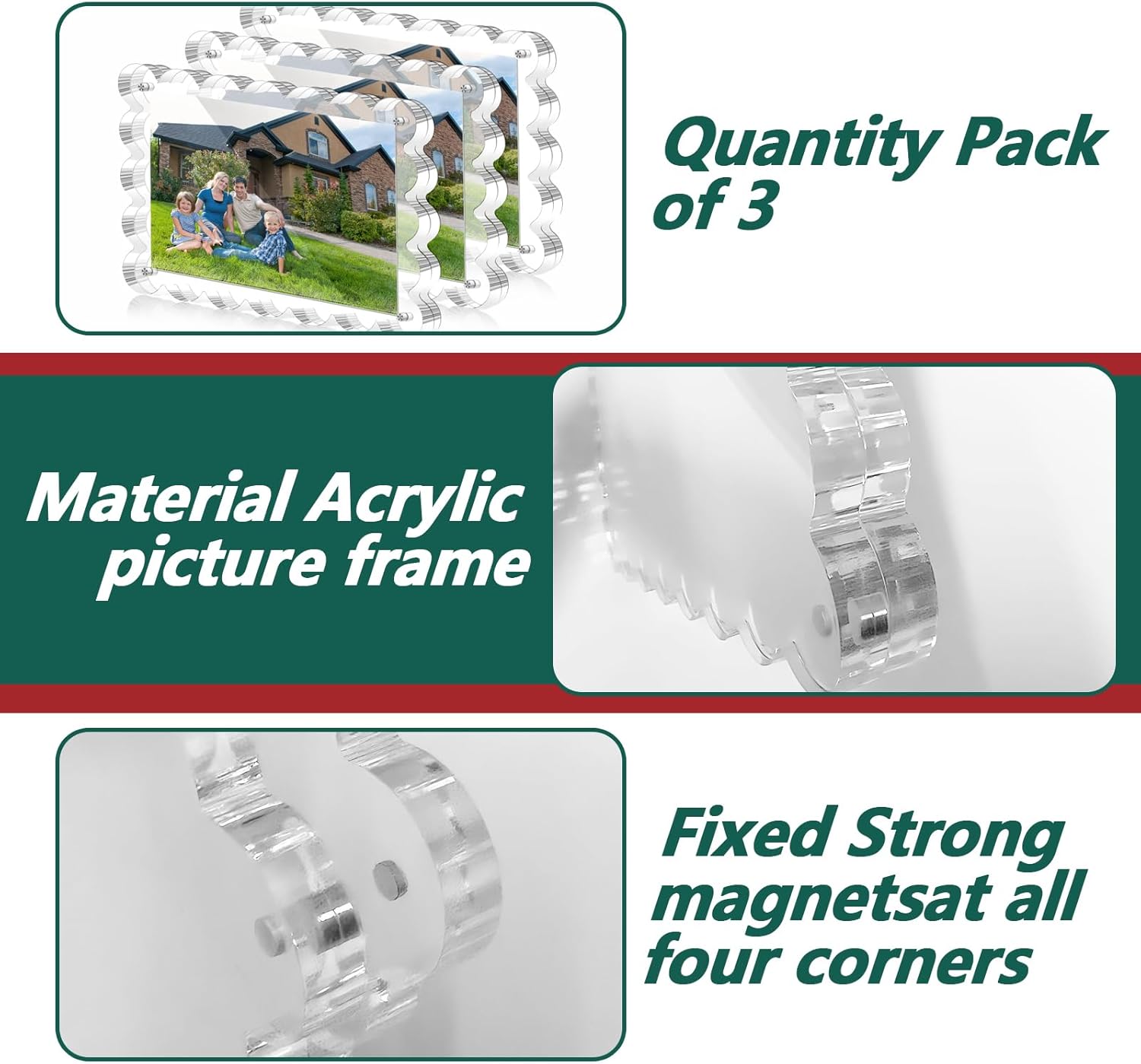 3 Pack Acrylic Picture Frame - 4x6 Magnetic Picture Frames, Double Sided Magnet Frames,10+10mm Thick Block, Clear Frameless Photo Scalloped Freestanding for Desktop Display
