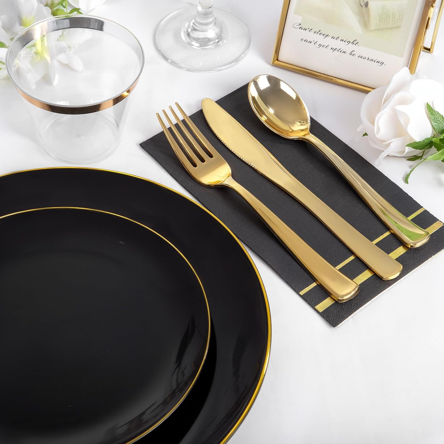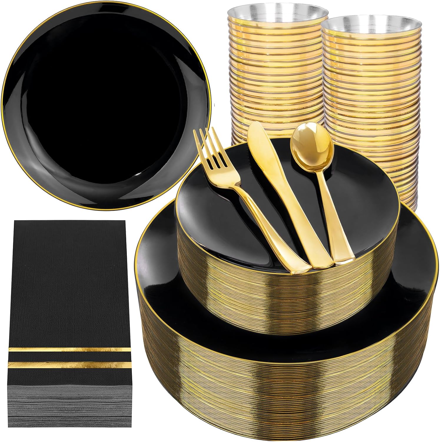 - CAREFULLY MATCHED : Our delicate disposable black gold plates, matched with unique napkins, exquisite cutlery and cups, elevate your dining to an elegant, stylish affair.