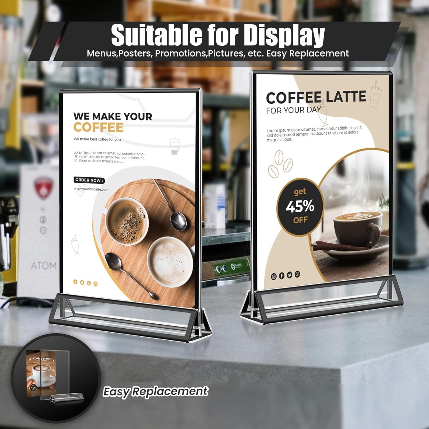 - 【Double-Sided Display Design】This uniquely designed 15 Pack 5x7 black acrylic sign holder features a back-to-back double-sided display design. Its vertical double-sided structure ensures clear visibility of two photos or menu signs, making your table arrangement practical and visually appealing from any angle.