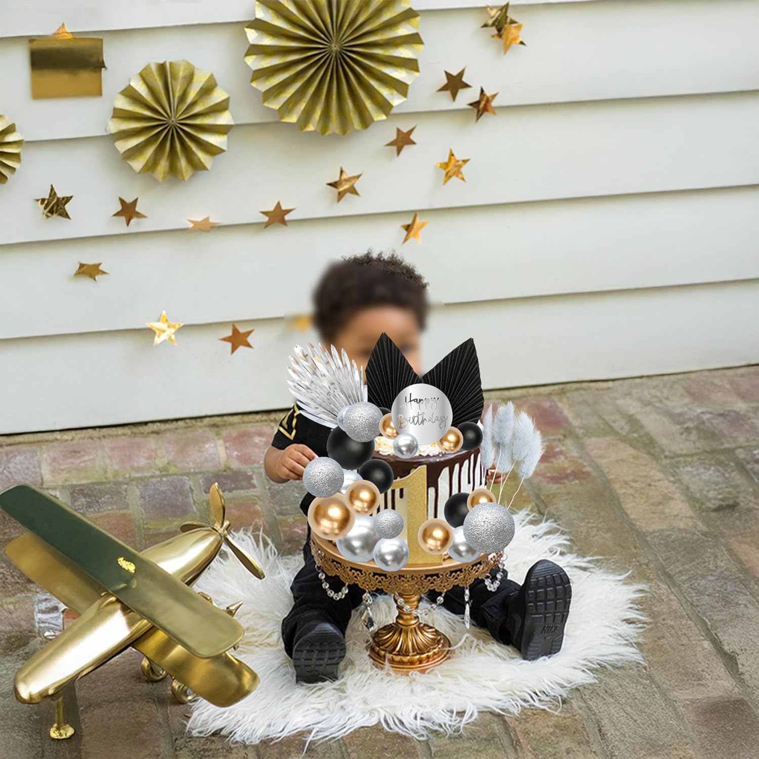 Ephlyn 33 Pack Balls Cake Toppers Boho Palm Leaves Cake Decorations Round Acrylic Happy Birthday Cupcake Toppers for Birthday Wedding Baby Shower Party Supplies Black Silver