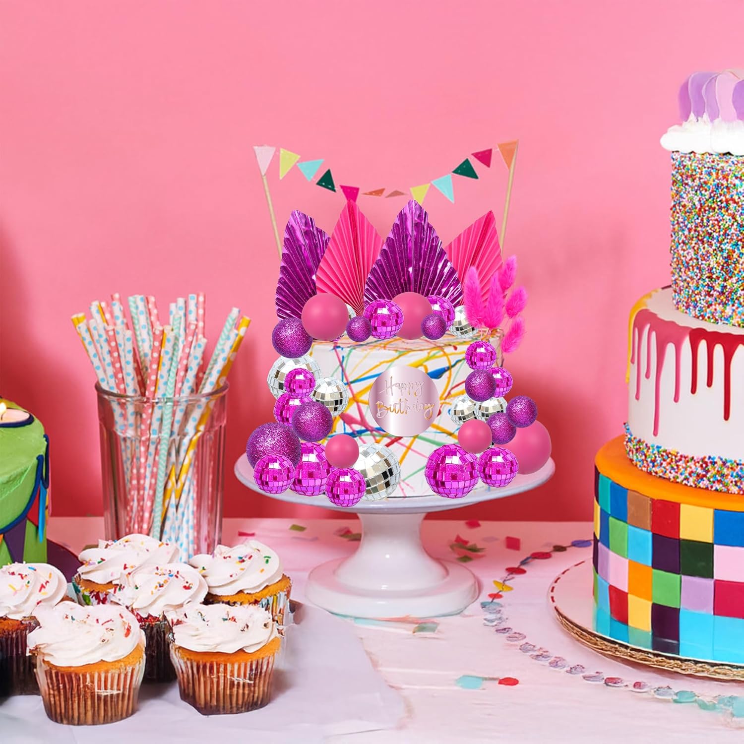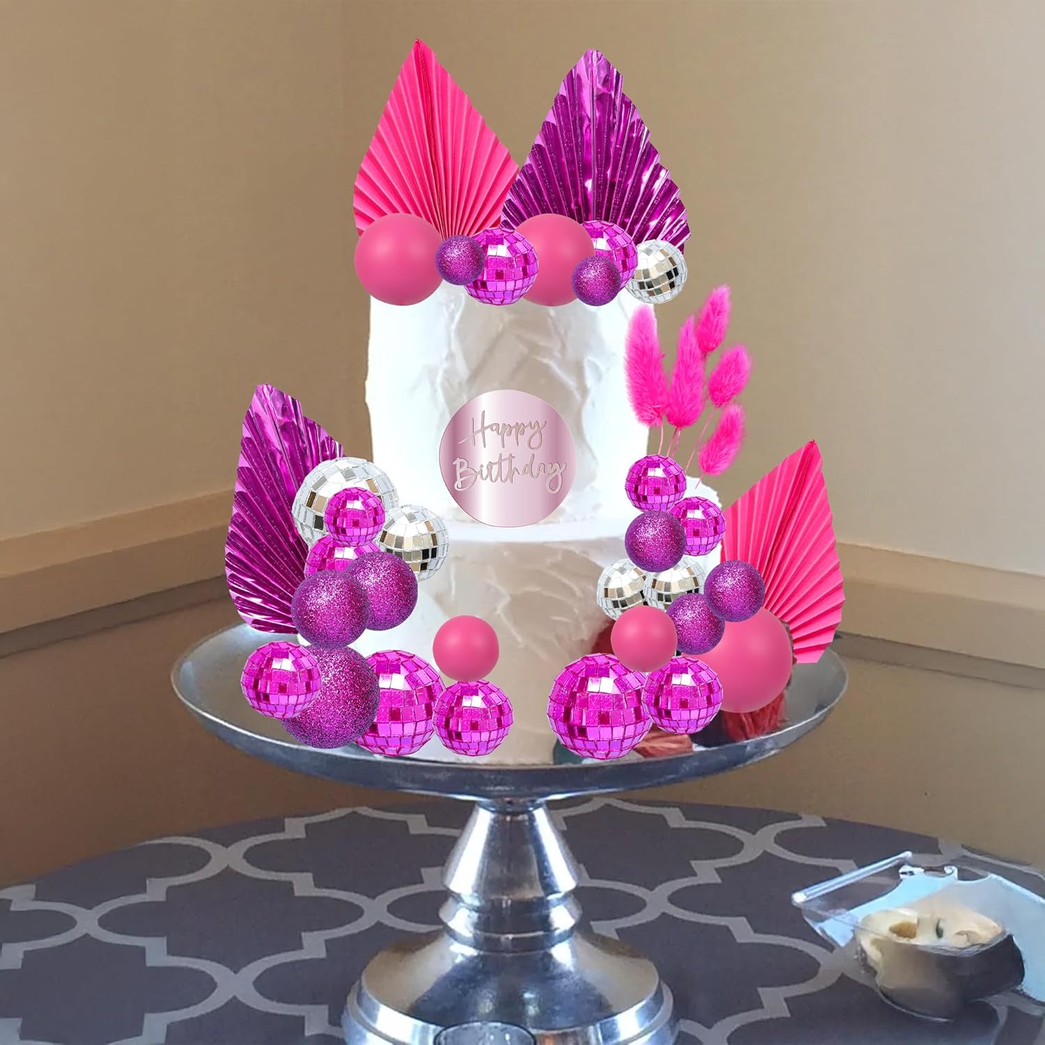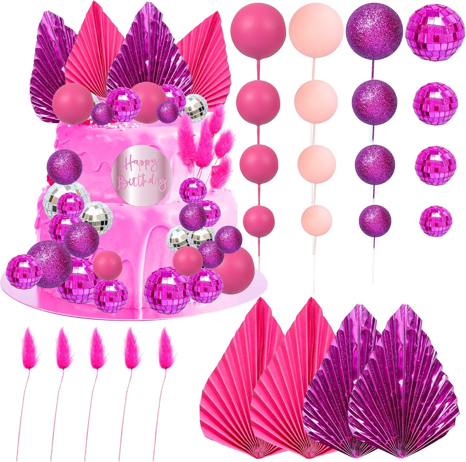 Ephlyn 33 Pack Balls Cake Toppers Boho Palm Leaves Cake Decorations Round Acrylic Happy Birthday Cupcake Toppers for Birthday Wedding Baby Shower Party Supplies Rose Red