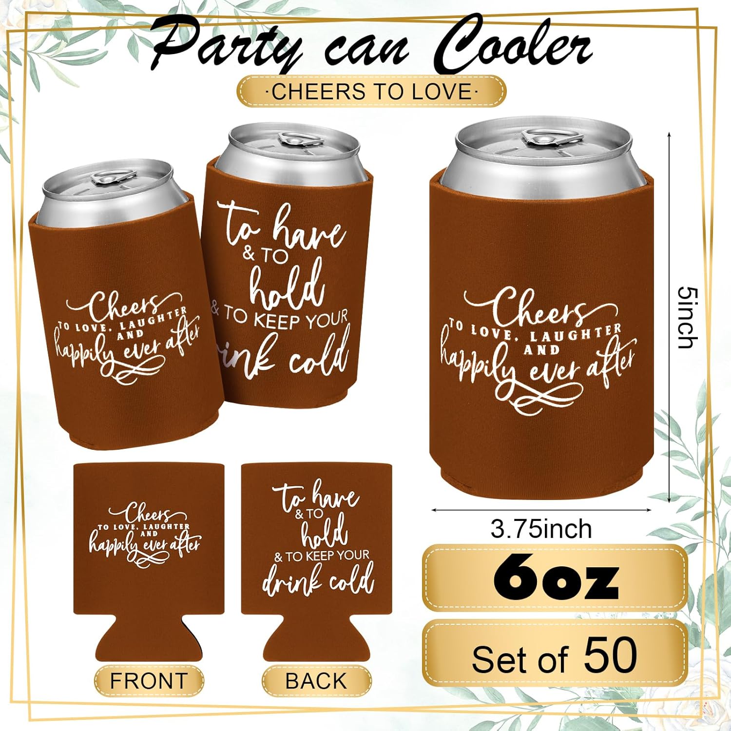 50 Pieces Chocolate Wedding Can Cooler Sleeves Bulk Engagement Party Favors for Guests Cheers to Love Laughter and Happily Ever After Rehearsal Dinner Decorations for Wedding Bridal