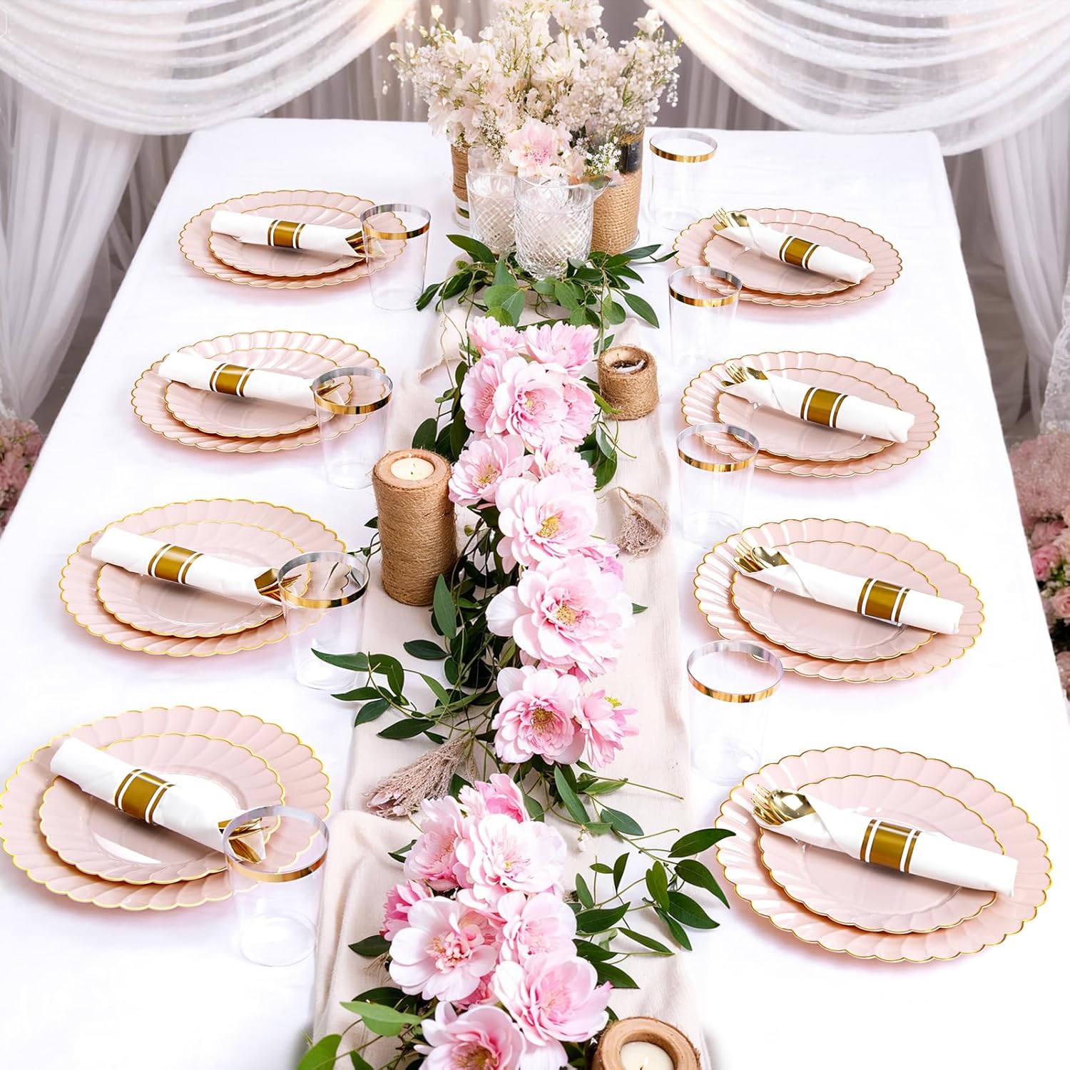 - Elegant Pink Wedding Tableware Collection - Create a sophisticated reception setting with pink plastic dinnerware set designed for 50 guests. Features 100 elegant pink scalloped plastic plates (50 scalloped 10.25" dinner plates and 50 scalloped 7.5" dessert plates), 150 gold utensils, 50 napkins, and 50 cups - ideal for formal plated weddings or buffet receptions