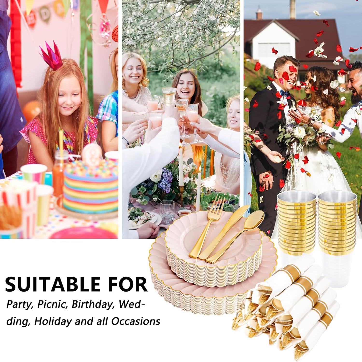 YOUBET 350PCS Pink Scalloped Plastic Plates - Pink and Gold Disposable Dinnerware Set Include 100 Plates, 150 Gold Silverware, 50 Cups, 50 Napkins for Wedding & Party