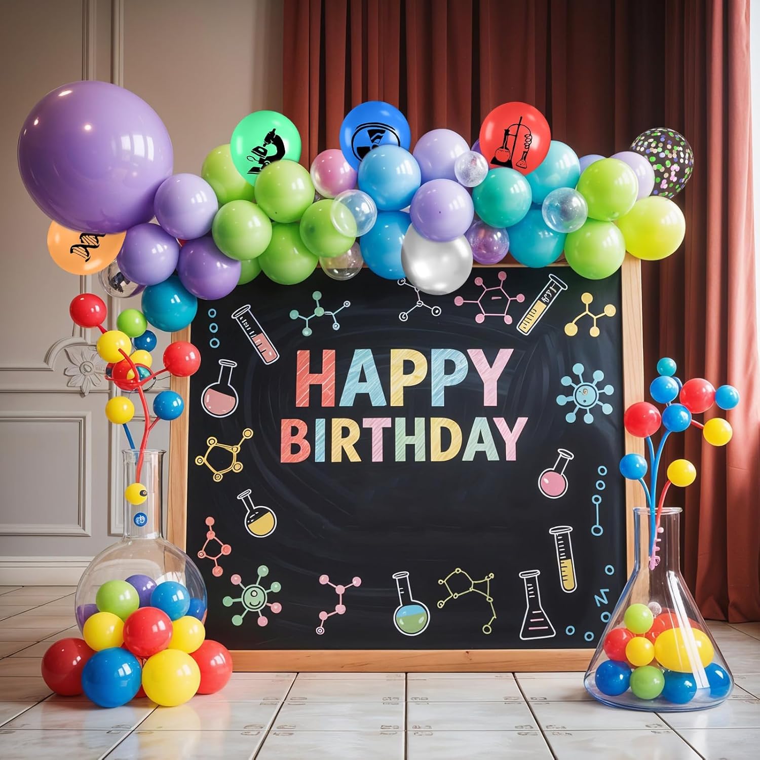 - 【Science-Themed Party Decor】Designed to energize any science party decorations, these balloons add creativity and color to your celebration. Whether you're hosting a science birthday party for s or decorating a classroom for science week, these balloons provide an exciting touch. Use them to build a balloon arch, photo wall, or centerpiece that showcases fun science icons like beakers, DNA strands, and microscopes