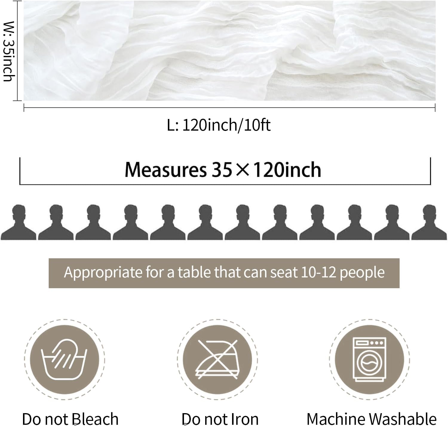 - 🥂【PACKAGE INCLUDED】You will receive 6 pieces of white cheesecloth table runners. Elegant and beautiful design, exquisite workmanship. Product size: Each boho table runner is 35 x 120 inches. Enough to cover rectangles and round tables, as well as long tables that are stitched together. It can even be used to belt chairs decorate napkins, background curtains, or even gift wrap. Round or square tables for 8-10 people, perfect for romantic and elegant party events.