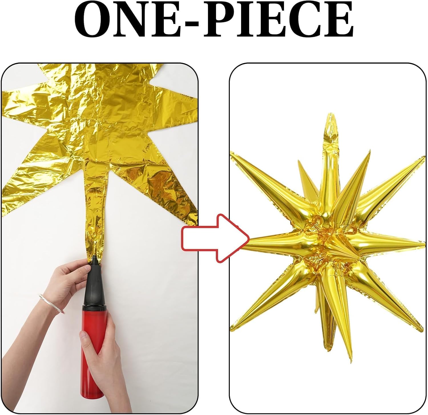- One-piece Star Balloons: Includes 12pcs One-piece star burst balloons in bold colors: 3pcs × 27in , 3pcs × 22in explosion star balloons and 6pcs × 10in four angle star balloons. Arrives ready to use with 1 straw and 1 roll of ribbon—just inflate and decorate.