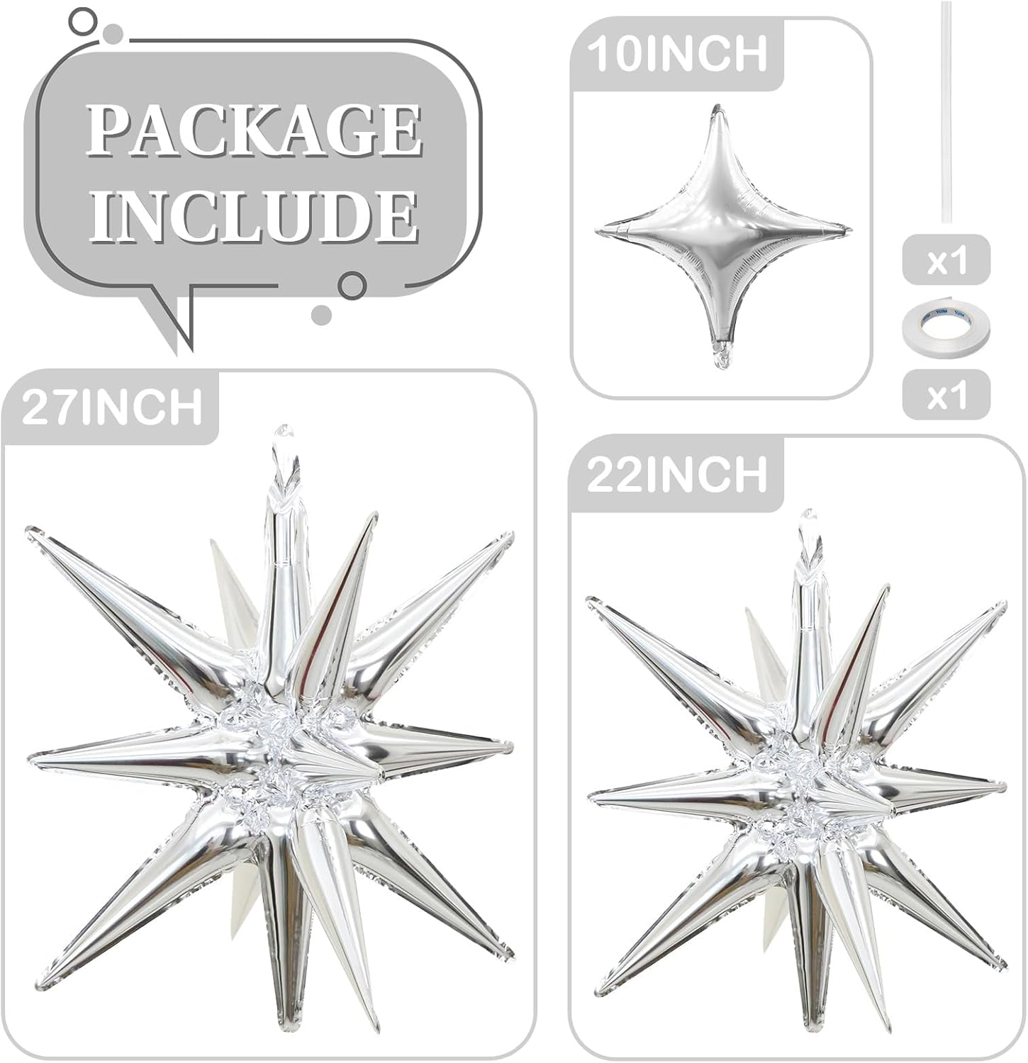 - One-piece Star Balloons: Includes 12pcs One-piece star burst balloons in bold colors: 3pcs × 27in , 3pcs × 22in explosion star balloons and 6pcs × 10in four angle star balloons. Arrives ready to use with 1 straw and 1 roll of ribbon—just inflate and decorate.