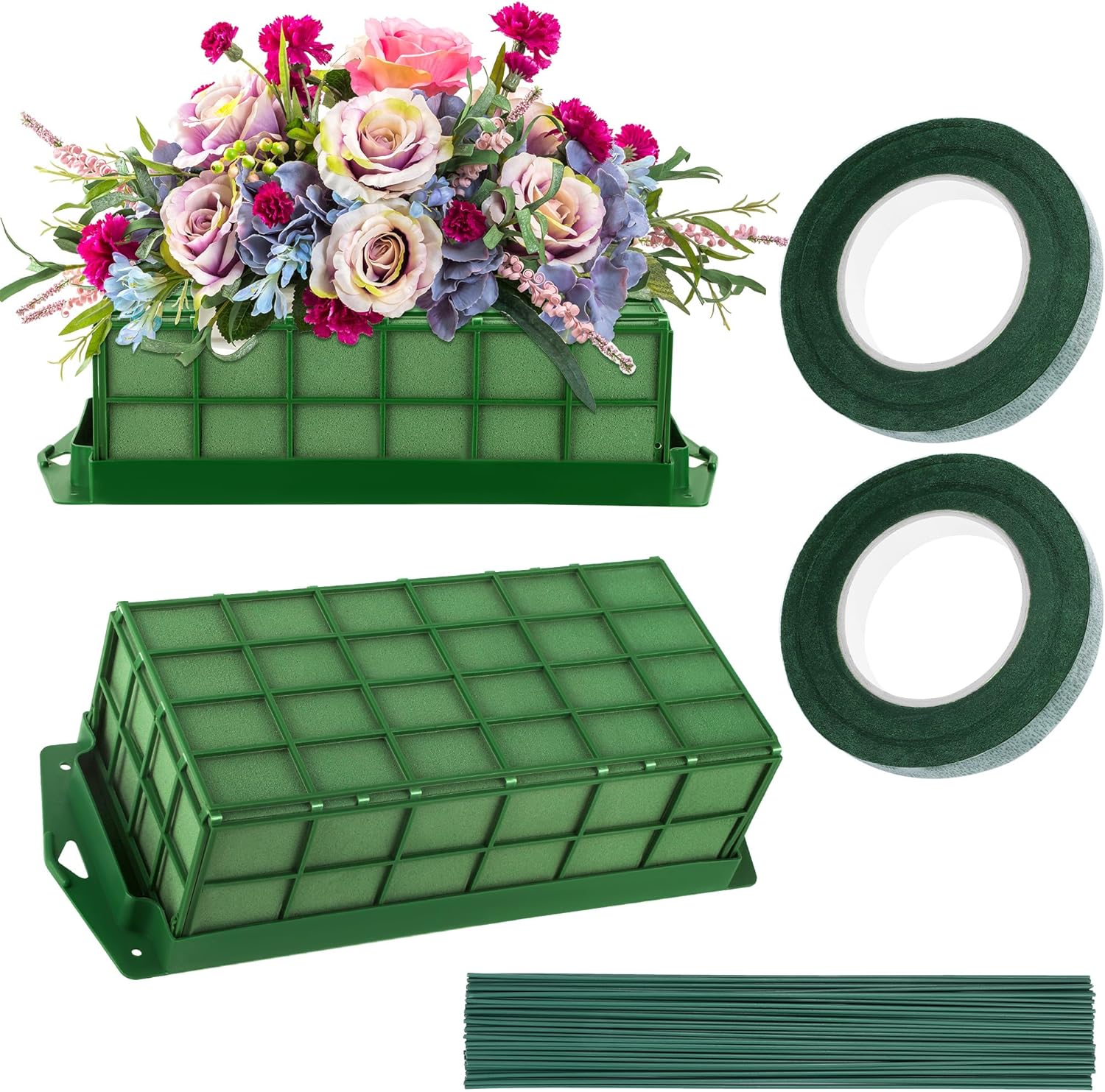 - Package Included: the package includes 2 floral foam cages, 2 rolls of floral tape in the size of 1.2 cm x 27 m, and 20 green floral stems in the length of 11.8 inch/30 cm, providing everything you need to craft beautiful arrangements; each floral foam cage measures approximately 11.8 x 4.3 x 3.1 inches/30 x 11 x 8 cm, making them a suitable choice for a variety of settings and match well objects you put on it