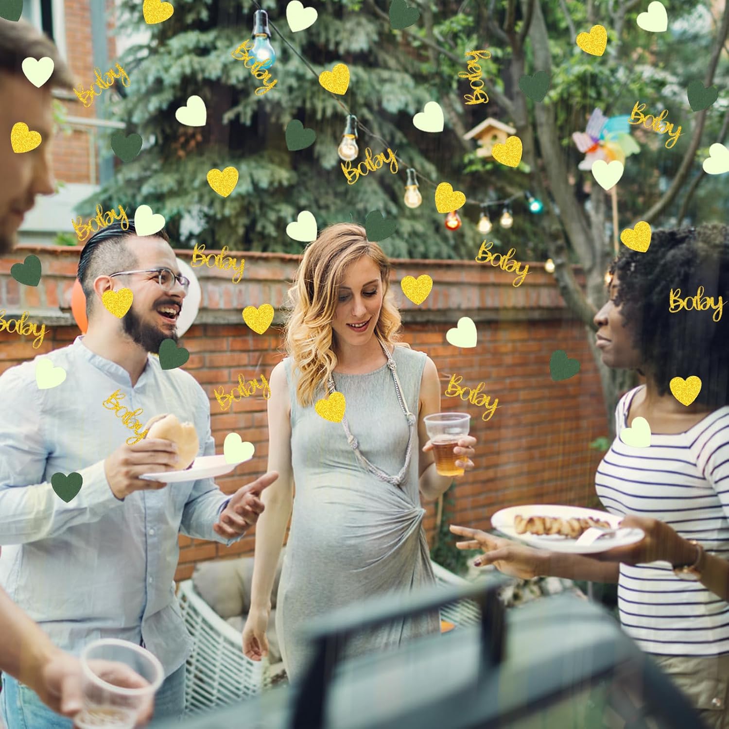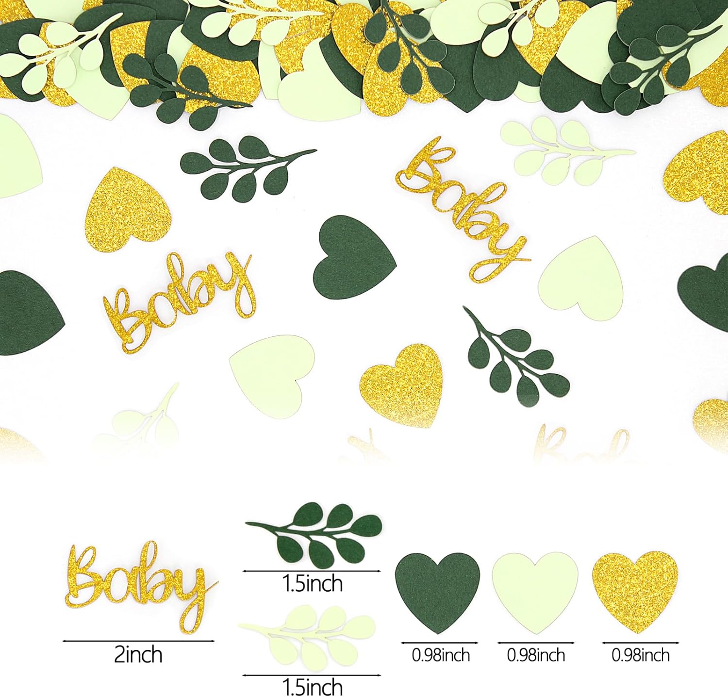 - 1.The greenery baby shower confetti package include:200pcs total,there are 3designs heart sage leaves and “baby” letters in 3 colors(glitter gold/light green/dark green/),looks fresh and full of vigor.