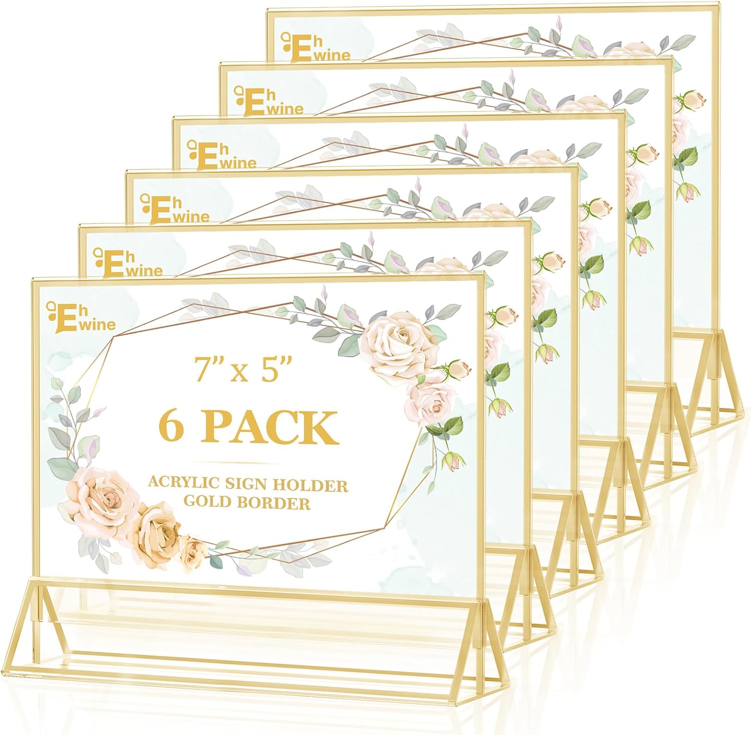EHWINE 6 Pack Acrylic Sign Holder 5 x 7 Horizontal, Double-Sided Stand up Table Top Sign Holders, Gold Acrylic Picture Frame Menu Flyer Paper Holder Display Stand for Office Business Store Wedding Party