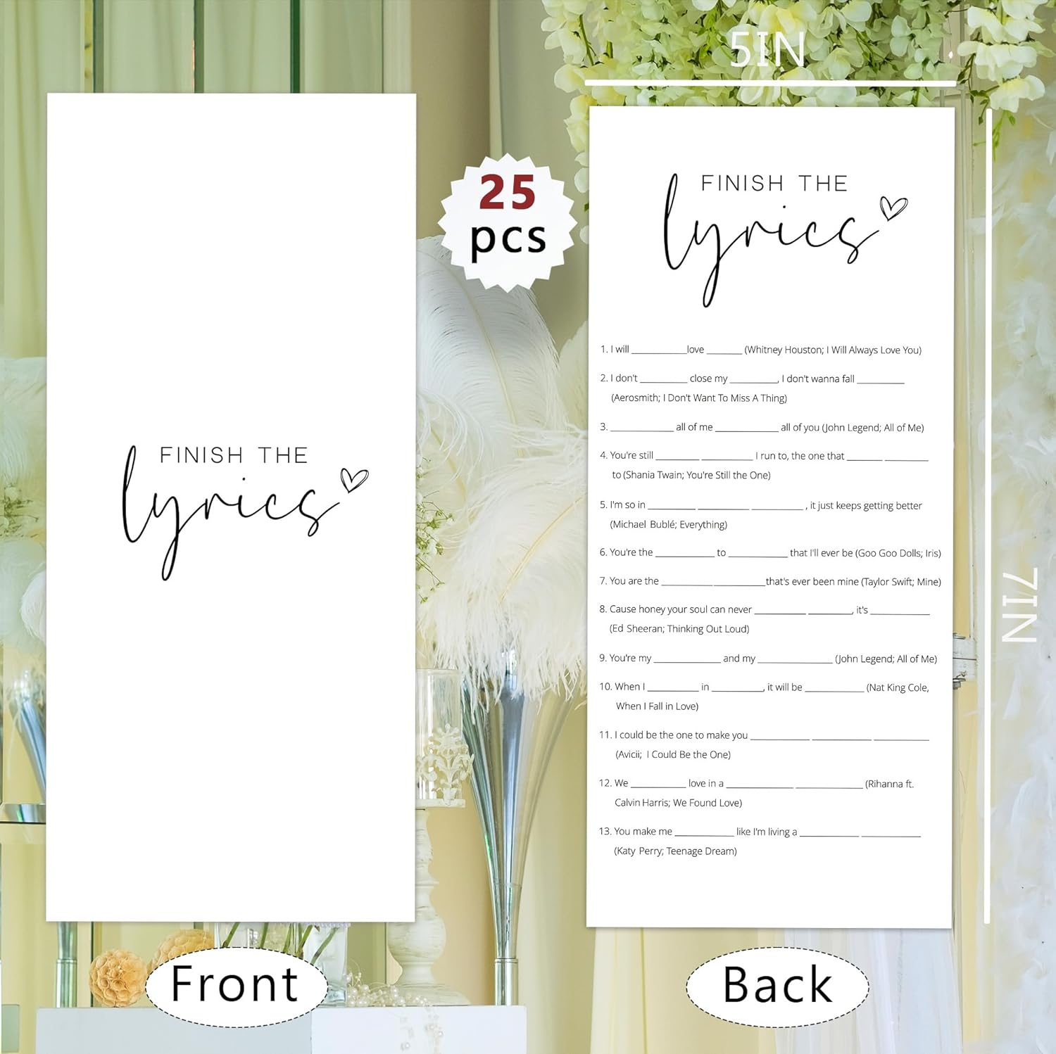 Bridal Shower Games, Finish the Lyrics, 25Pcs 4x9inch Minimalist White Double-Sided Bridal Game Cards with 1 Answer Key, Wedding Shower Games for Guests, Engagement Bachelorette Party Supplies - A09