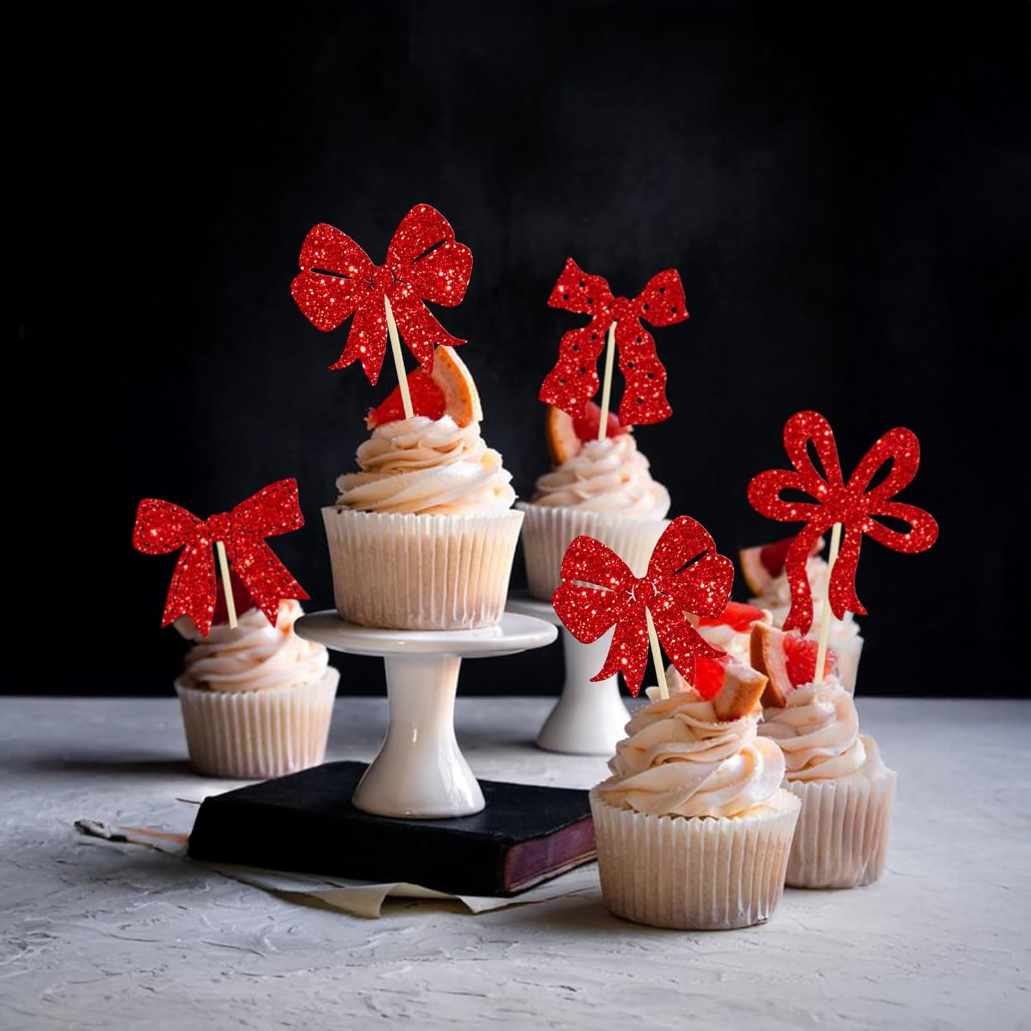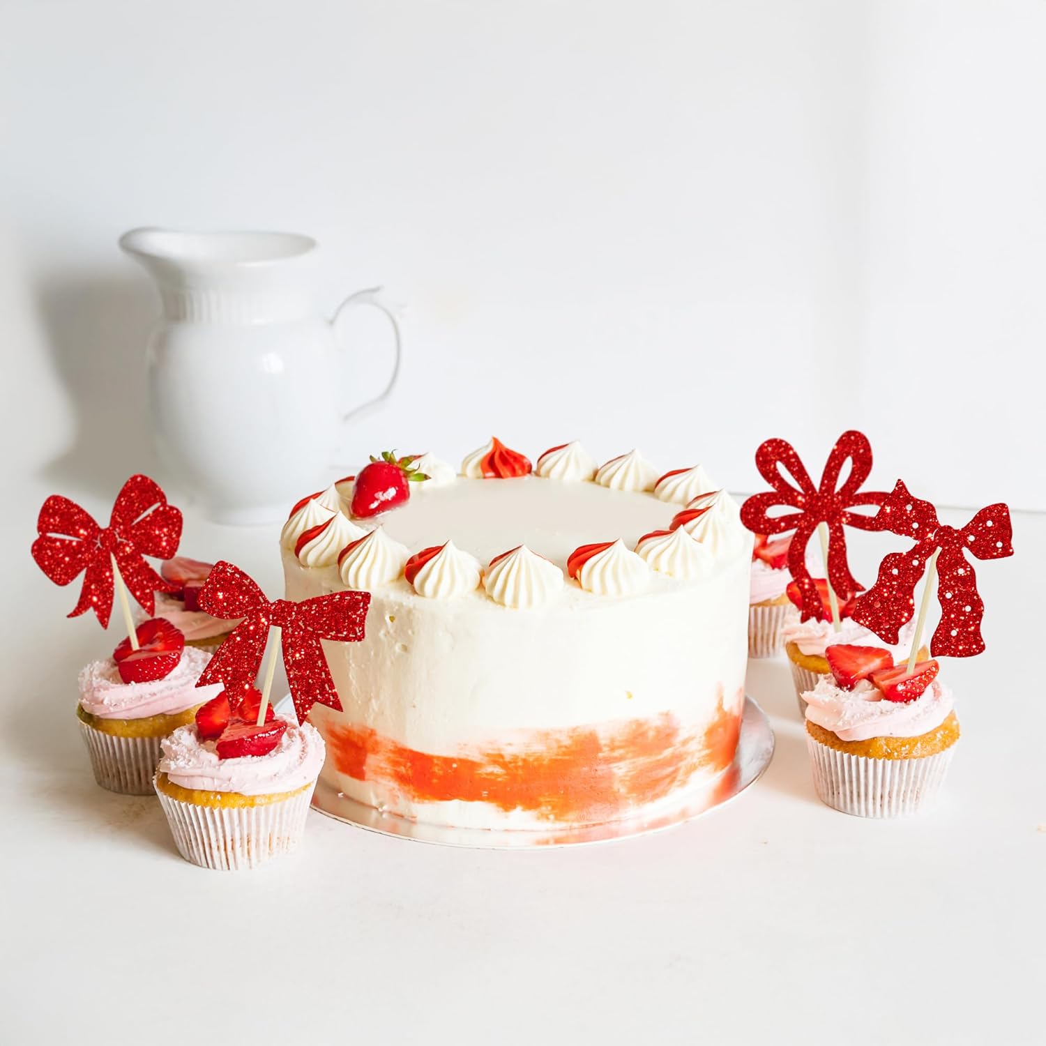 Ephlyn 24Pcs Bow Cupcake Toppers Bow Birthday Cake Topper Girls Birthday Party Decorations Bowknot Cupcake Decorations for Bridal Baby Shower Birthday Wedding Themed Party Red