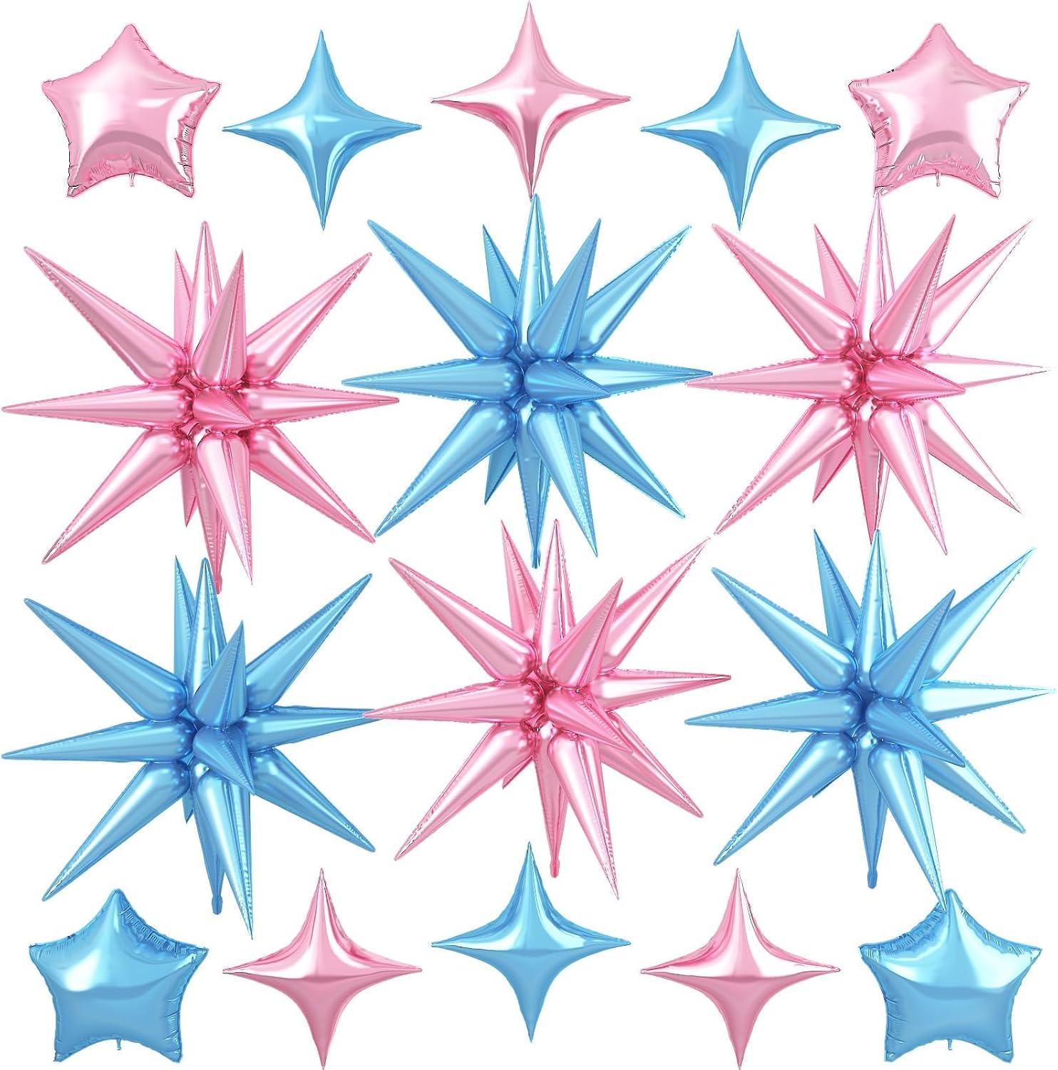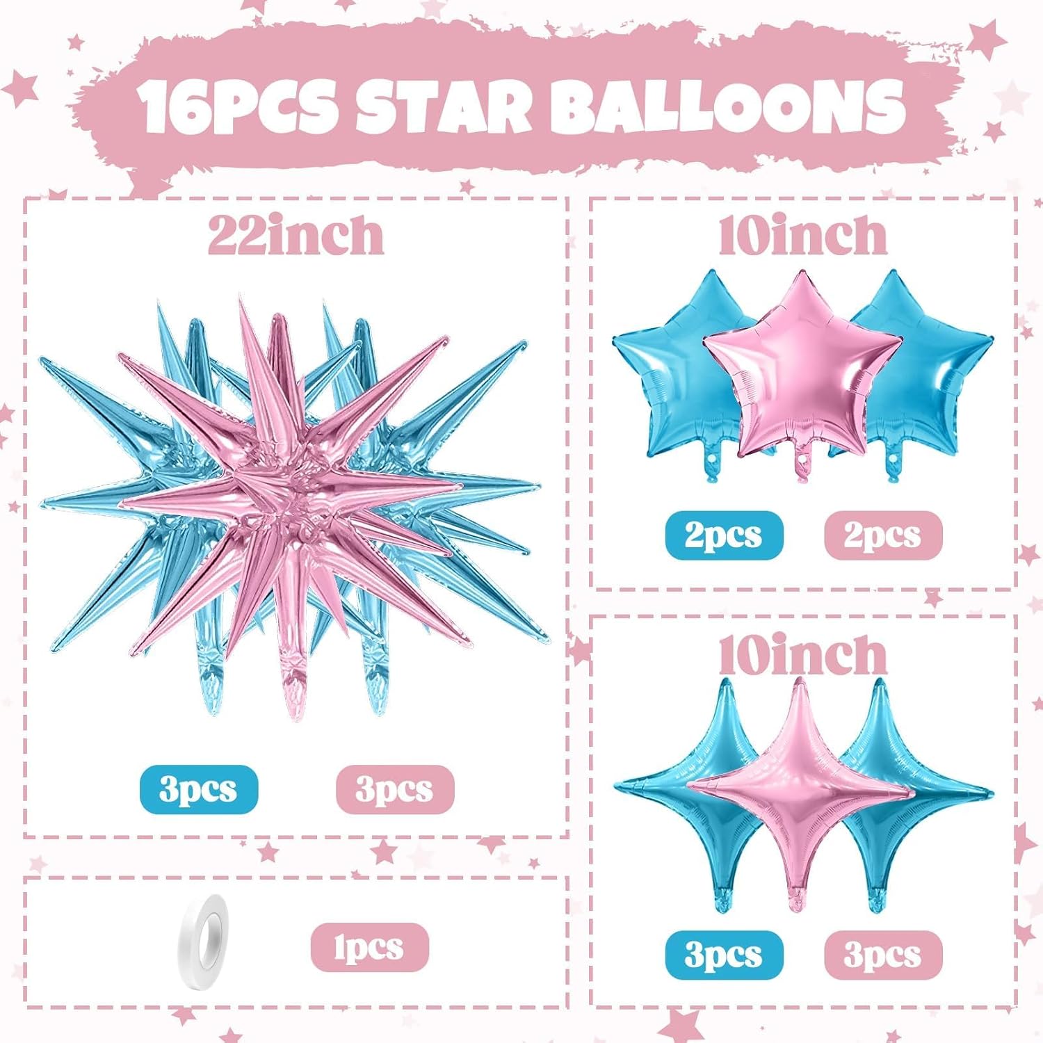 Pink Blue Star Balloon,16Pcs Star Foil Balloons Set with 22Inch Explosion Spike Cone Balloons and 10Inch Quadrangle Helium Balloon for Birthday Wedding Baby Shower Party Decorations