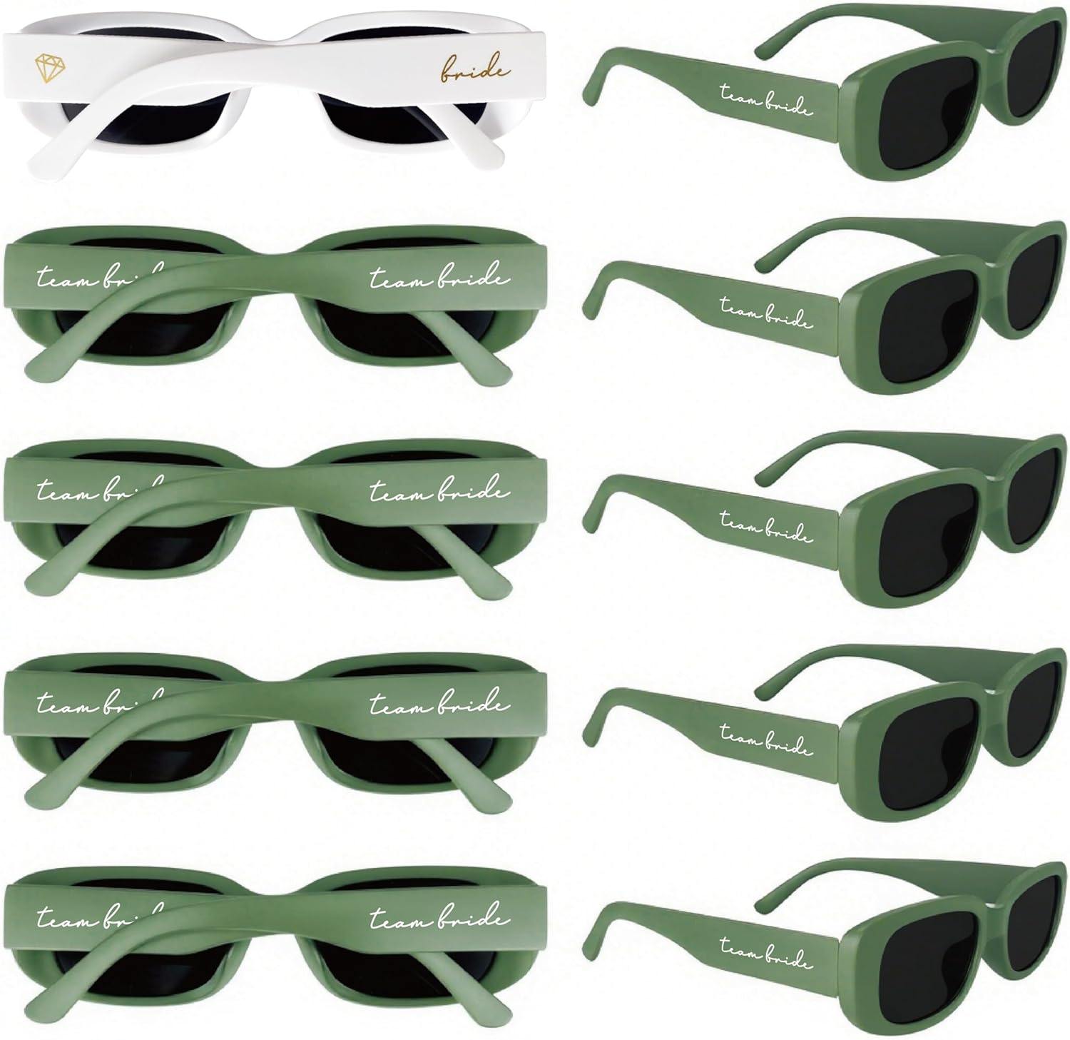 - Bachelorette Sunglasses Set: This bachelorette party essentials kit is designed to make your pre-wedding celebrations unforgettable-featuring 1 pair of sunglasses emblazoned with "Bride" and 9 pairs of coordinating "Team Bride" shades for the bridesmaids. Perfect for capturing that "bride and her crew" magic, this bachelorette sunglasses set ensures everyone shines bright, both in the moment and in the photos you’ll cherish forever.