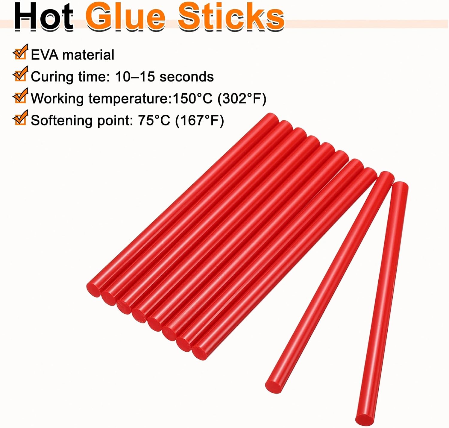 - Size - Hot glue sticks size: 11 x 250mm / 0.43 x 9.84 inch (D*L); Curing time: 10–15 seconds; Working temperature: 150°C (302°F); Softening point: 75°C (167°F).
