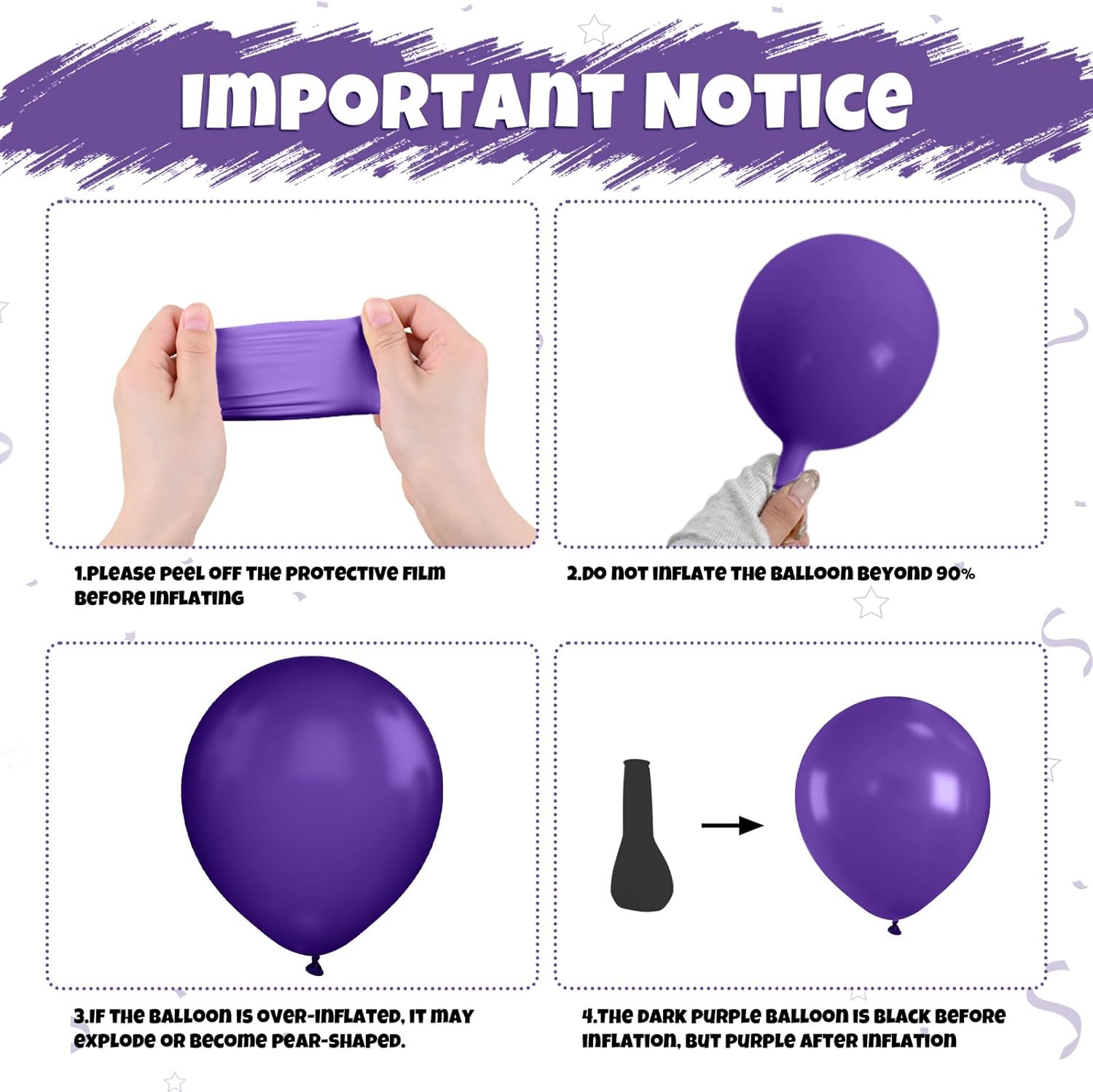 - 【Customer Satisfaction Assurance】The dark purple balloon is black before inflation, but purple after inflation. We strive to provide quality products and great service. If you have any concerns, we’re here to help. Let this black and purple balloon set bring unforgettable energy to your party.