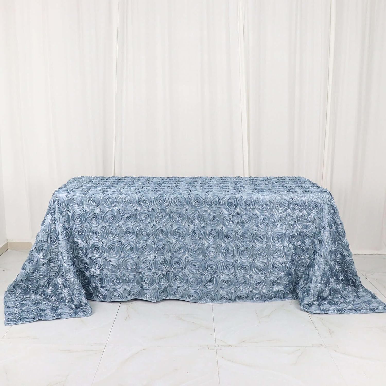 - Quantity: 1 Rectangular Tablecloth Material: High Quality Satin Color: Dusty Blue Style: 3D Rosette Size: 90"x132" Edges: Serged Shape: Rectangular Gives floor length hang on 6ft (30"x72") rectangle table