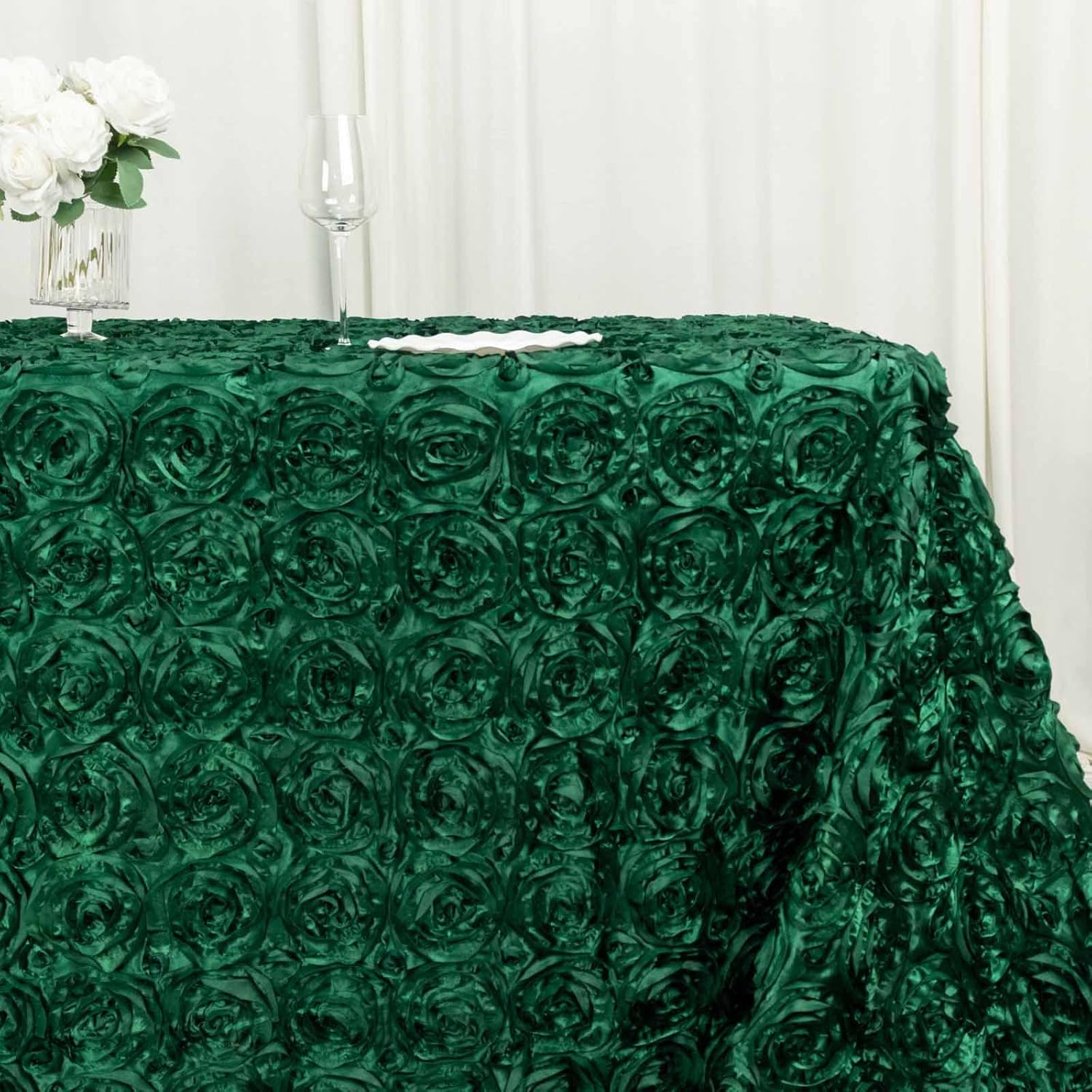 - Quantity: 1 Rectangular Tablecloth Material: High Quality Satin Color: Hunter Emerald Green Style: 3D Rosette Size: 90"x132" Edges: Serged Shape: Rectangular Gives floor length hang on 6ft (30"x72") rectangle table