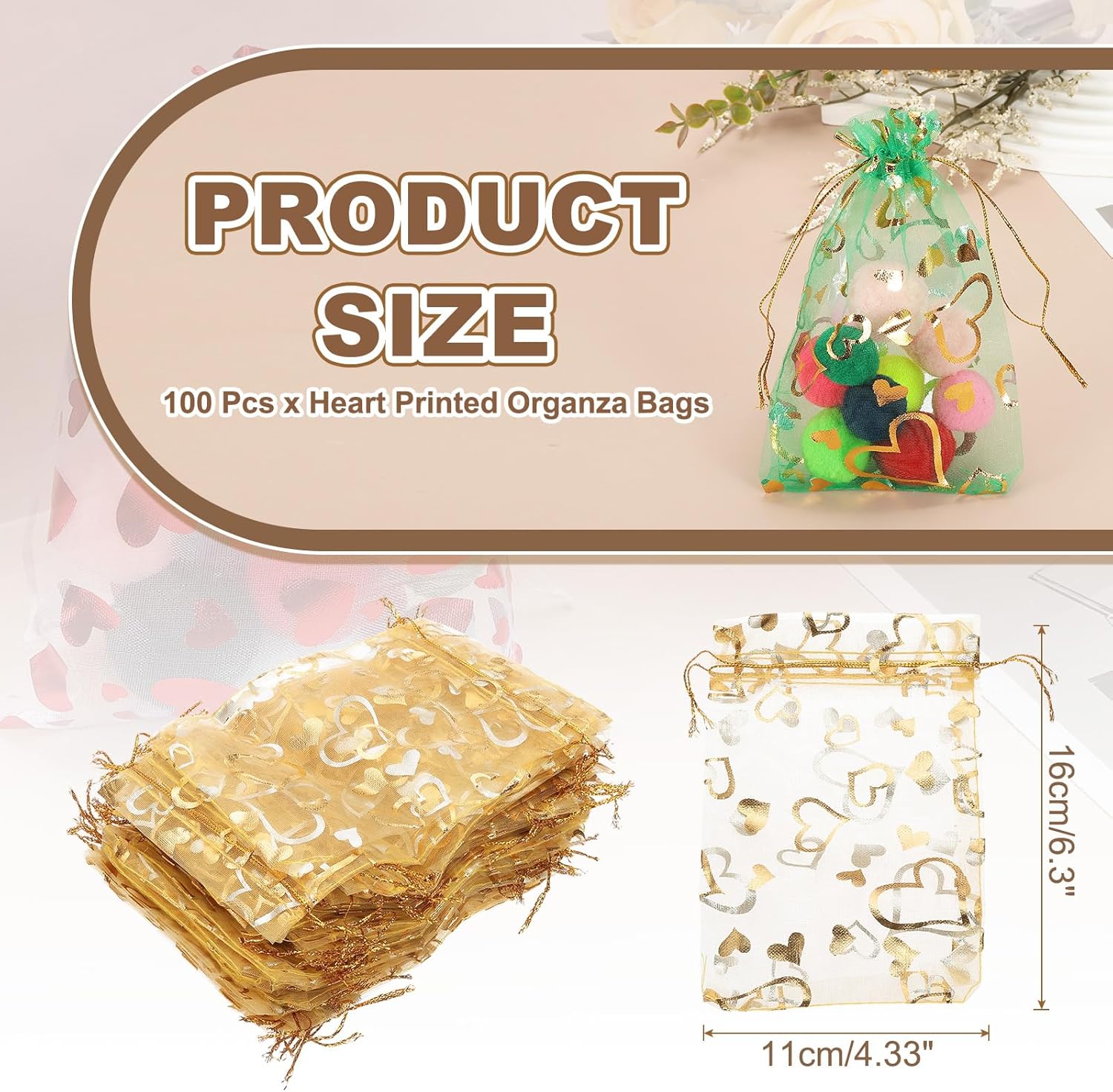 - Color: Gold; Material: Polyester; Size: 16x11 cm/6.3x4.33 Inch(L*W); Packing List: 100 Pcs x Heart Printed Organza Bags (NOTE: Please confirm the size before choosing our product)