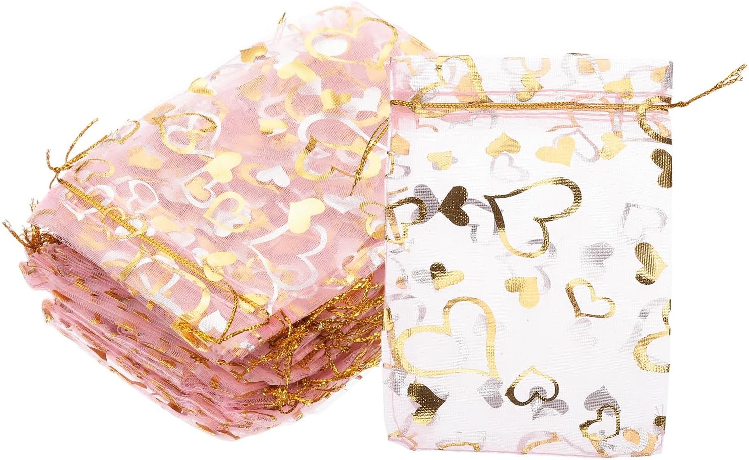 - Color: Pink; Material: Polyester; Size: 16x11 cm/6.3x4.33 Inch(L*W); Packing List: 100 Pcs x Heart Printed Organza Bags (NOTE: Please confirm the size before choosing our product)