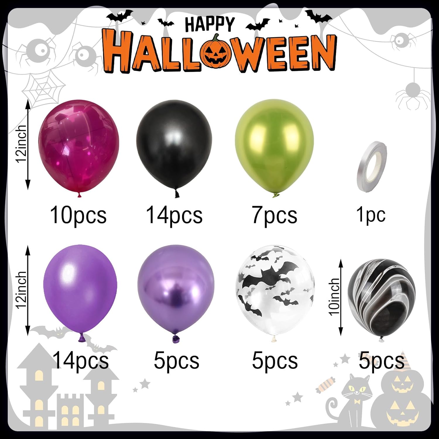 - Helloween Balloons Set: This hot red green balloons set includes 10pcs hot pink balloons, 14pcs pearl black balloons, 7pcs metallic green balloons, 14pcs pearl dark purple balloons, 5pcs metallic purple balloons, 5pcs bat printed balloons, 5pcs agate balloons, and 1pc silver ribbon. Adding a playful seasonal vibe, it offers everything needed to create a vivid and unforgettable party display.